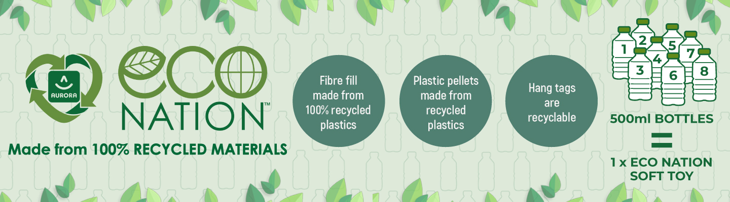 Every year over 400,000,000 plastic bottles globally are being recycled, reused and repurposed, contributing to a greener earth. Eco Nation plush are made from sustainable and eco-friendly materials. Eco Nation contributes to a greener planet by: