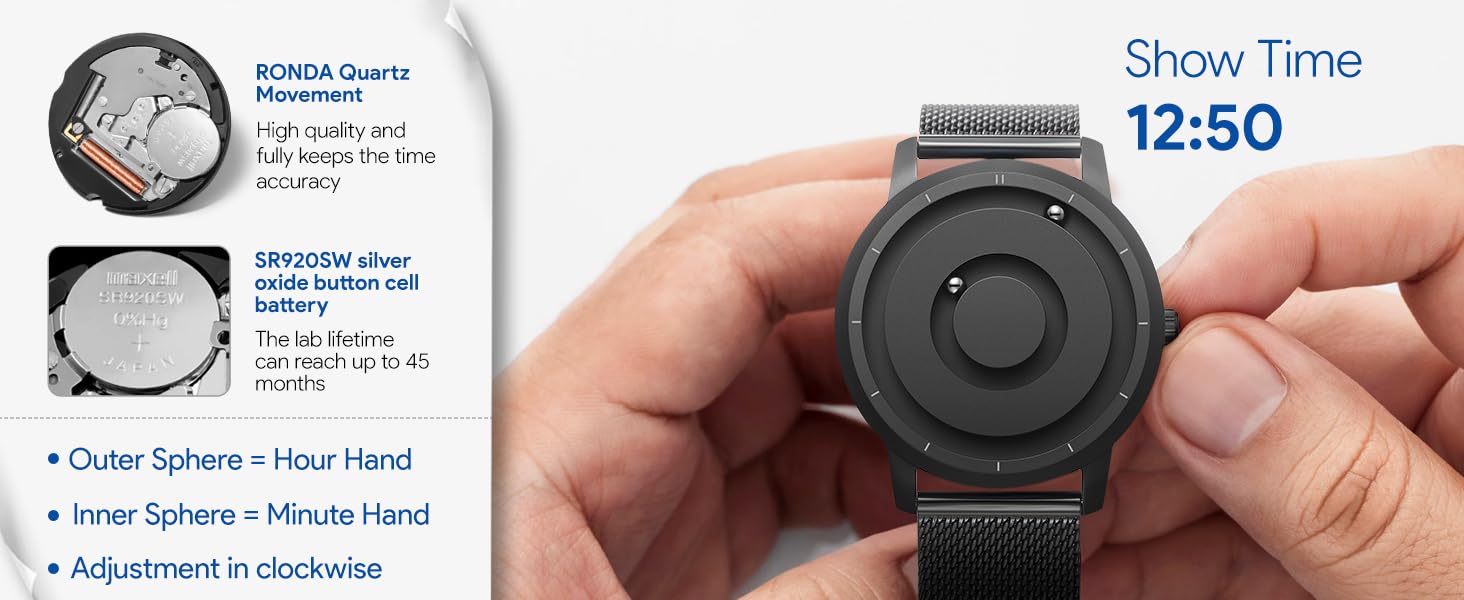 - Futuristic Men's Watches: 2 spheres float above the 40mm dial with a 20mm adjustable quick-release strap - inner=minute, outer=hour, breaking convention and ensuring time accuracy & strong magnetic force with a unique fashion design