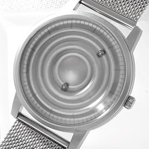 The small balls levitate magnetically above the dial to indicate the time. In this design case, the ball will slide because of the watch shaking. But when the watch is not shaking, the ball will display the current time due to the magnetic force.