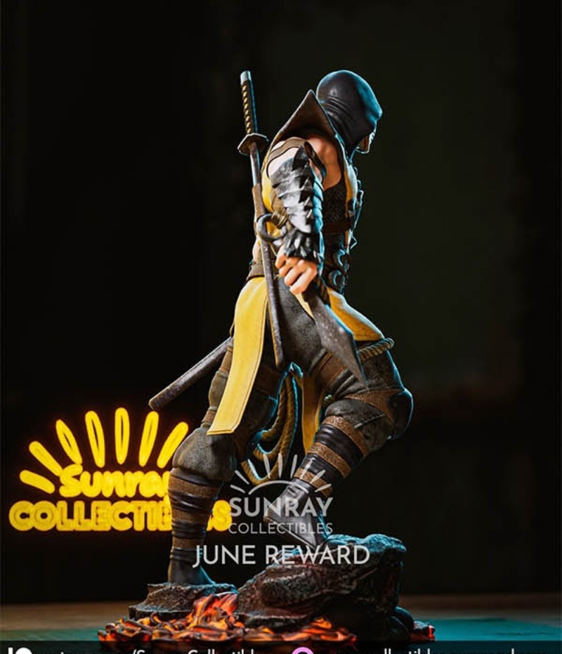 This figure is 3D printed, ensuring precision and fine detail in every part of the sculpture. The 3D printing technology allows for smooth surfaces and sharp contours, capturing the intricate armor and posture of Scorpion in stunning detail. Each piece is carefully designed to create a true-to-character representation of Scorpion as he appears in the Mortal Kombat games.