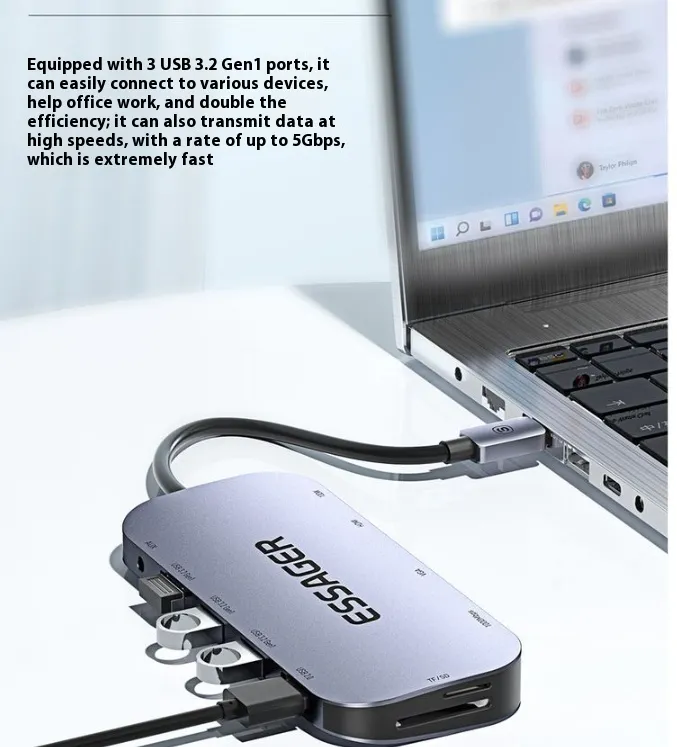 With multiple USB 3.0 and USB-C ports, this hub allows you to quickly transfer data, whether you're connecting an external hard drive, flash drive, or other devices. USB 3.0 provides data transfer speeds of up to 5 Gbps, ensuring quick and efficient file sharing, while the USB-C port supports higher speeds and even charging capabilities.
