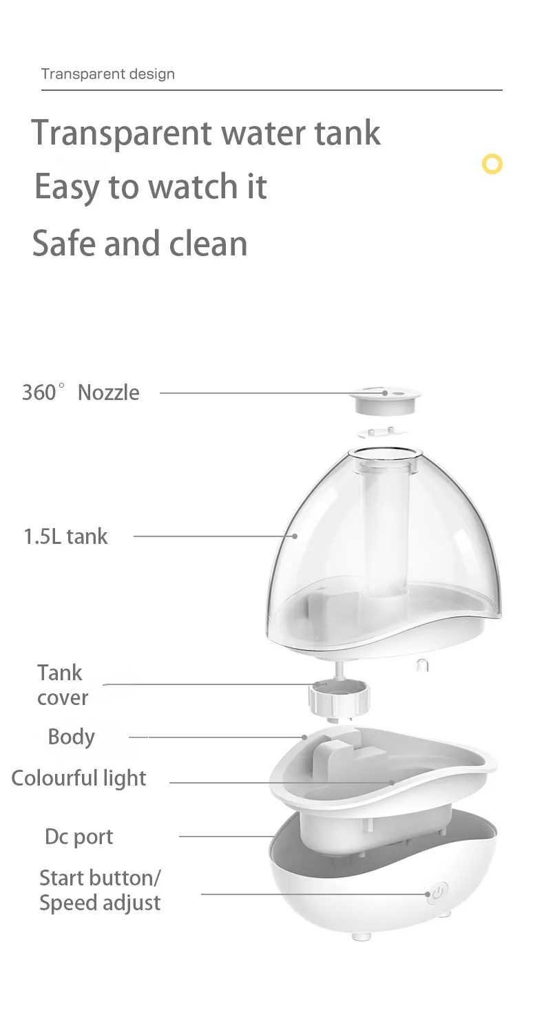 Its sleek, modern design makes it a great addition to any room's decor, whether it's your personal bedroom, a guest room, or even a hotel lobby. As a multifunctional device, it works both as a humidifier and a diffuser, providing essential moisture to the air while also releasing your favorite essential oils for a calming and revitalizing atmosphere. Whether you're using it to alleviate dry skin, reduce the effects of seasonal allergies, or simply create a more pleasant living space, the 1.5L Large Capacity Bedroom Hotel Diffuser is your ultimate solution.