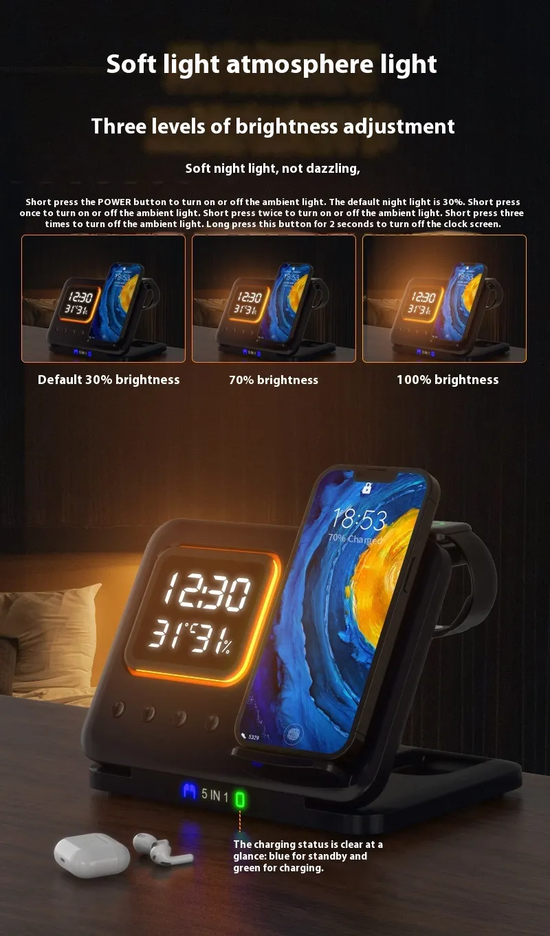 Upgrade your charging station with the 15W Wireless Charger Stand 5-in-1 LED Digital Alarm Clock. This all-in-one charging dock combines fast wireless charging with a sleek digital alarm clock, making it the perfect addition to your desk or bedside table. Whether you're charging your smartphone, wireless earbuds, or smartwatch, this fast-charging dock ensures your devices are powered up and ready to go. With its modern LED display and multi-device support, this is more than just a charger – it’s a functional and stylish gadget for your home or office.