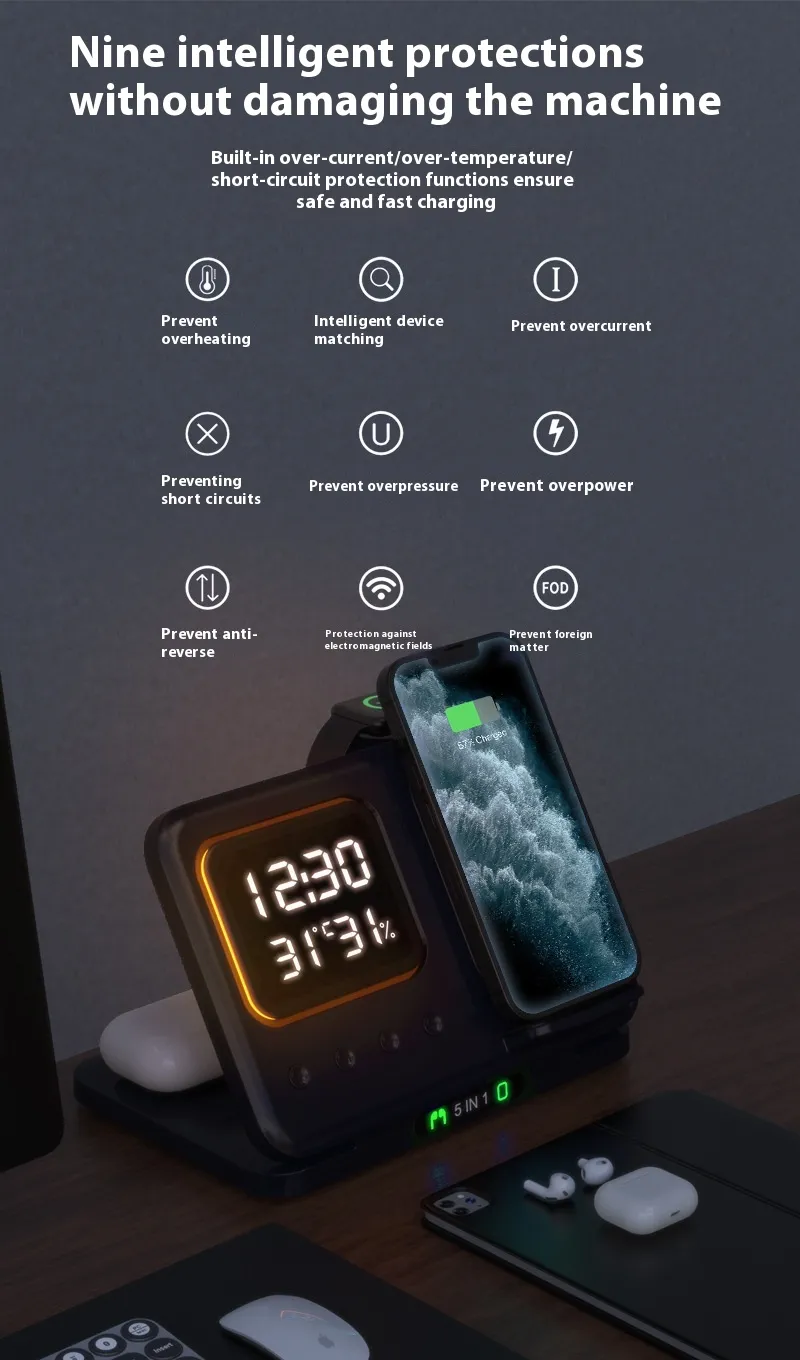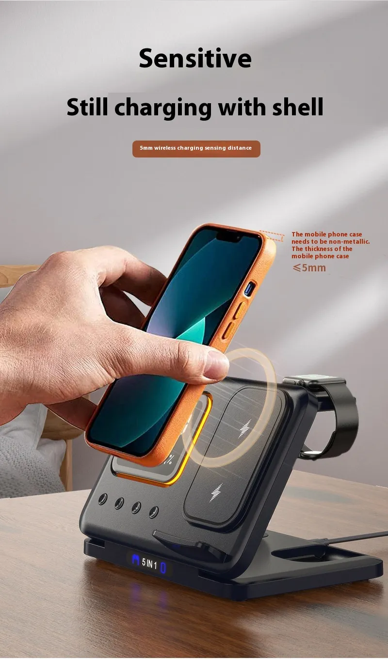 - 5-in-1 Multi-Device Charging: Simultaneously charge your phone, smartwatch, earbuds, and more.