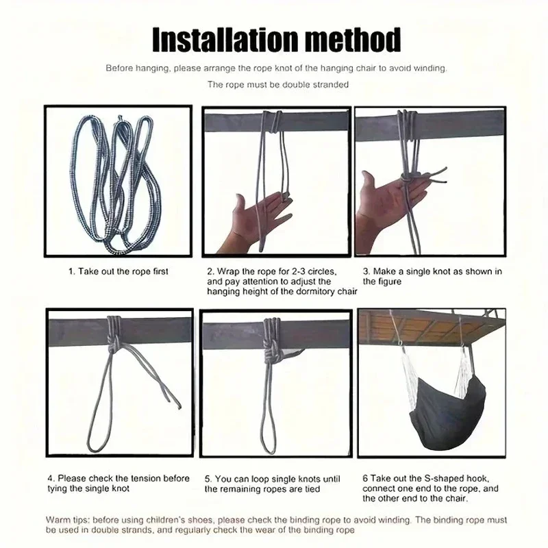 - Set It Up – Attach the ropes to the support structure and adjust the length as needed to ensure the chair is at a comfortable height.