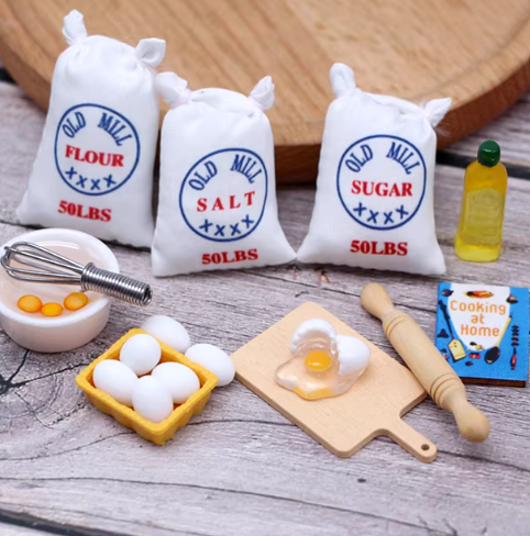 The detailed whisk and flour bag are crafted to look like real kitchen tools, adding authenticity to dollhouse setups.