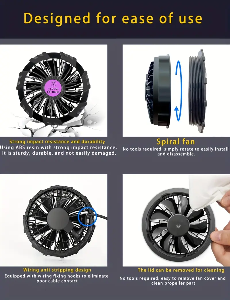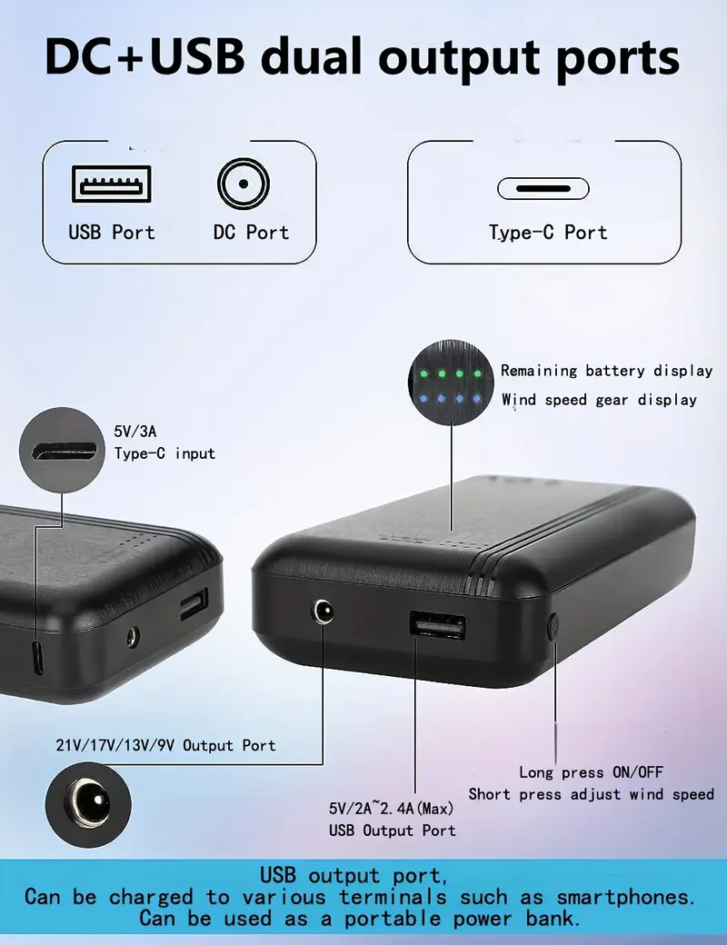 Ultra High Rotation Fan / Powerful Blower: The latest air conditioning work clothes fan in the summer is equipped with 9 blades that utilize aerodynamics, reducing the resistance of wind by 35%, and the wind is centered to create a powerful breeze. In addition, it uses a new Japanese plushless motor with excellent torque characteristics, high output, and a maximum speed of 7,500 rpm. The moment you turn it on, you will experience an amazing super strong air flowFour level wind speed regulation, paired with a 21V-20000mAh dedicated battery. Long press the power button on the battery to turn it on, and short press the power button to For Switch between four levels of wind speed freelySimple and sophisticated design and shock resistant durability: Made of high temperature and impact resistant ABS resin, this product is sturdy and resistant to breakage, and has excellent durability. The cooling fan also features a wire cord release design to eliminate cable contact failure, secure the power plug firmly and provide more stable power supply to the fanGreat for a variety of occasions such as architecture, civil engineering, factory work, fiLower Legg, forestry work, farms, outdoor work, transportation, Conflictehouse work, mountain climbing, walking, golf, touring, camping, and more