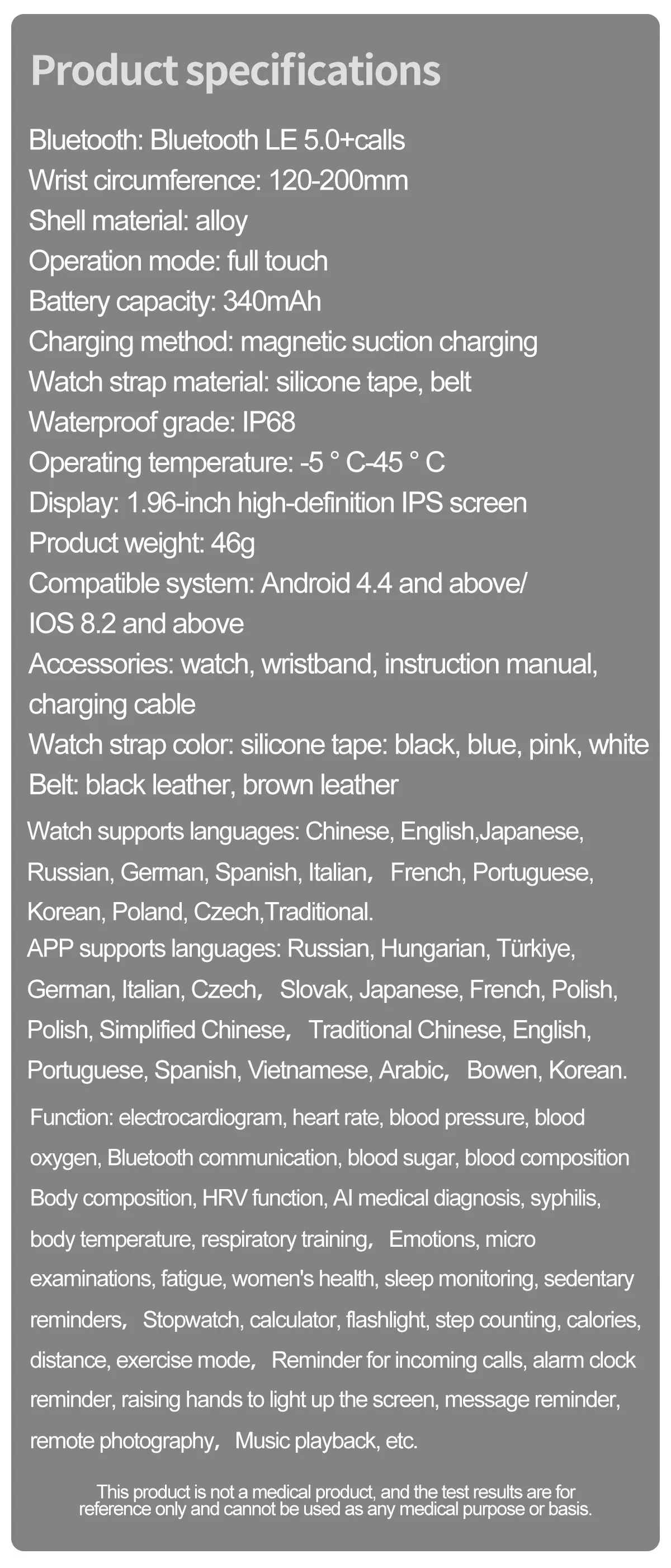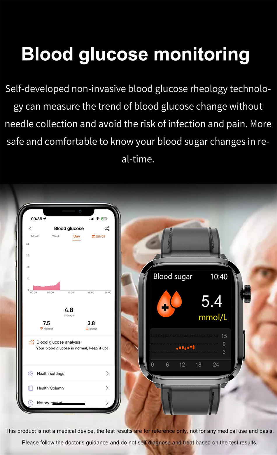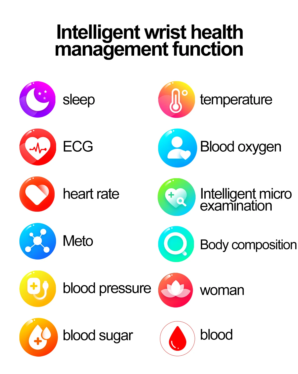 The 2024 AI Medical Diagnosis Smart Watch is a breakthrough device in health monitoring, designed to track vital metrics and provide medical insights right from your wrist. Featuring advanced AI technology, this smartwatch monitors blood lipids, uric acid, blood glucose, ECG, PPG, and more, delivering real-time health insights with medical-grade accuracy. It’s designed with integrated Bluetooth calling, allowing you to manage calls directly from the watch, and voice-enabled controls for hands-free operation. Perfect for health-conscious individuals and those managing specific health conditions, this smartwatch offers a complete health monitoring suite in a sleek, user-friendly design.