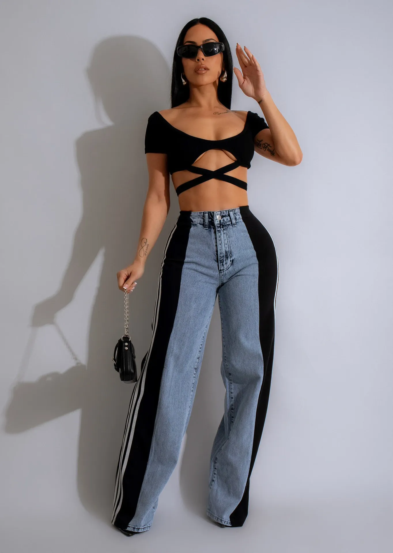 2024 Fashion Casual High Waist Elastic Straight Leg Trousers Three Stripe Patchwork Denim Wide Leg Pants Streetwear