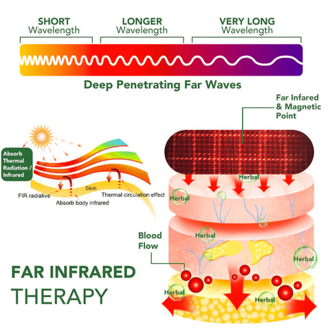 Far infrared therapy Far infrared radiation is a part of the electromagnetic infrared spectrum. Far infrared radiation can penetrate the subcutaneous tissues of the human body up to 16 mm, i.e. it can penetrate deep into muscle tissues, tendons, nerves, blood vessels and ligaments. It helps to repair damaged cells, dilates microvessels, promotes blood circulation, activates enzymes, improves blood circulation and accelerates the metabolism of blood and cell tissues. It does this by stimulating heart rate and activity, even when you are not exercising,It will also achieve this by stimulating heart rate and activity.
