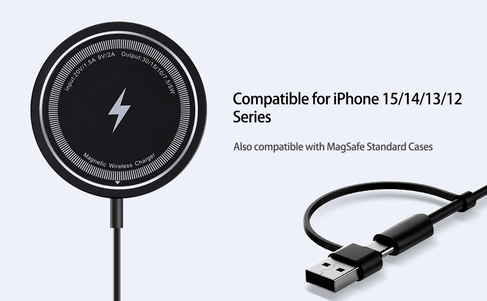 The 20W Magnetic Wireless Charger boasts a sleek and modern design that seamlessly blends with your tech setup. The charger features a minimalist, round charging pad with a smooth, matte finish that feels premium to the touch. The compact and lightweight design makes it highly portable, allowing you to carry it effortlessly in your bag or pocket. The charger comes with a sturdy USB Type C cable, ensuring a reliable and stable connection for quick power delivery. The magnetic charging pad is designed to align perfectly with the magnetic ring in iPhone models 12 through 15, providing a secure hold and optimal charging efficiency.