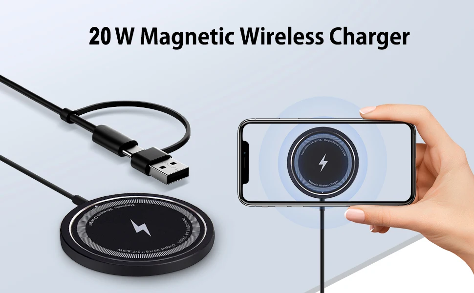 - Can I use this charger with a case on my iPhone? Yes, the 20W Magnetic Wireless Charger is designed to work with MagSafe-compatible cases. It may also work with other cases, but magnetic alignment and charging efficiency may vary.
