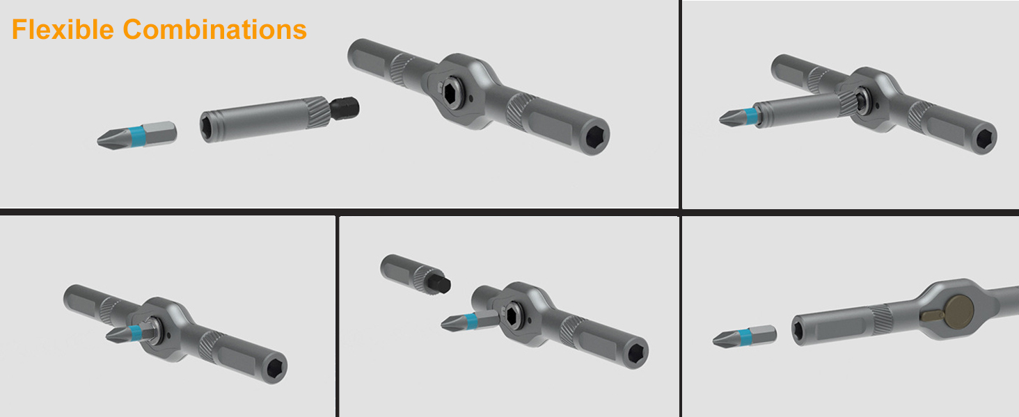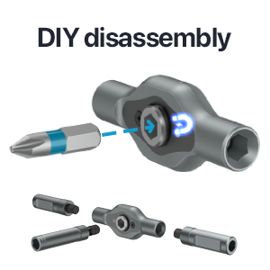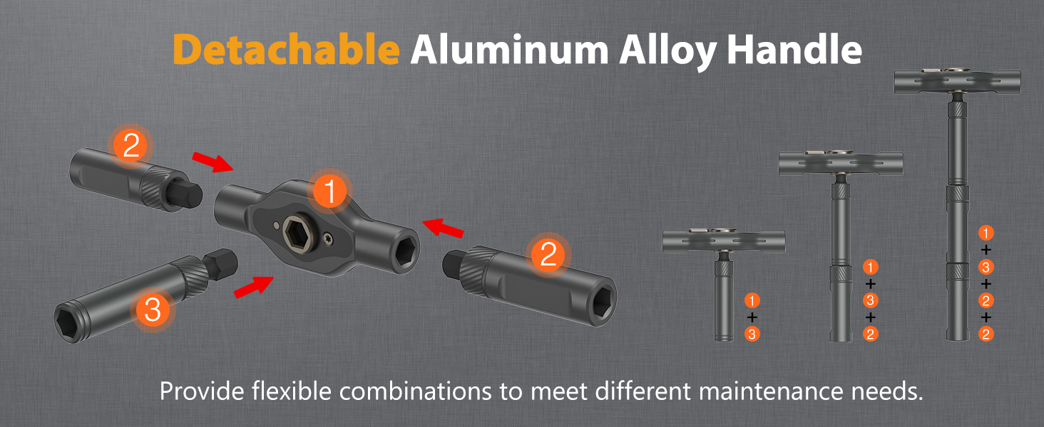 - Flexible Ratchet Handle Design - The handle features a detachable structure, allowing for various combinations and multifunctional adjustments to fit different situations, like using in narrow spaces. The ergonomic aluminum handle design is lightweight yet rugged, crafted from hot-forged aluminum alloy with high-precision CNC molding for durability and oxidation resistance. Its lightweight construction ensures ease of handling, making it perfect for extended use without fatigue.