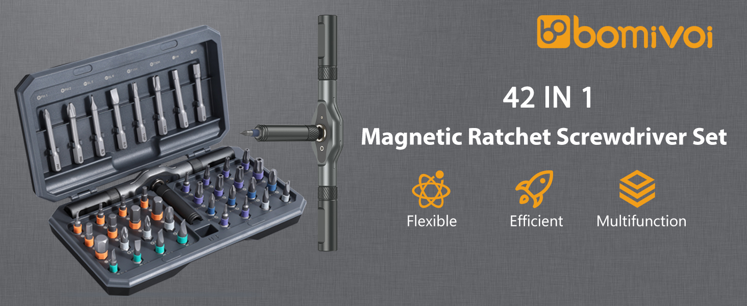 - Effortless Ratcheting Mechanism - Equipped with a 6.2-degree ratchet and 58-tooth forward-reverse ratchet mechanism, offering 80% effort savings. With a 50N.m torque, Bomivoi ratcheting screwdriver set tool makes it simple to tighten or loosen screws without wrist adjustments, saving time and effort in every repair job.