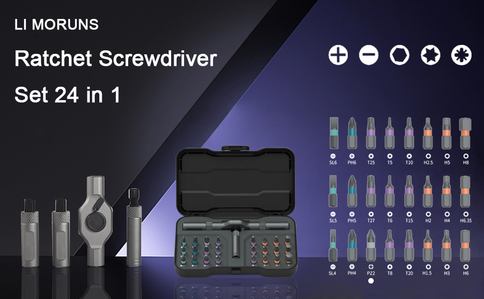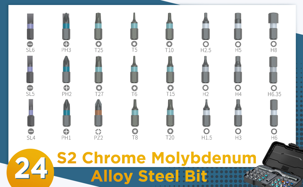 - 24 in 1 Industrial grade S2 Multi-Purpose Ratchet Screwdriver Set: Slotted (SL4,SL5,SL6), Phillips (PH1,PH2,PH3), Torx (T5, T6, T8, T10, T15, T20, T25,T27),Hexagon(H1.5,H2,H2.5,H3,H4,H5,H6,H6.35,H8),Pozidriv(PZ2).
