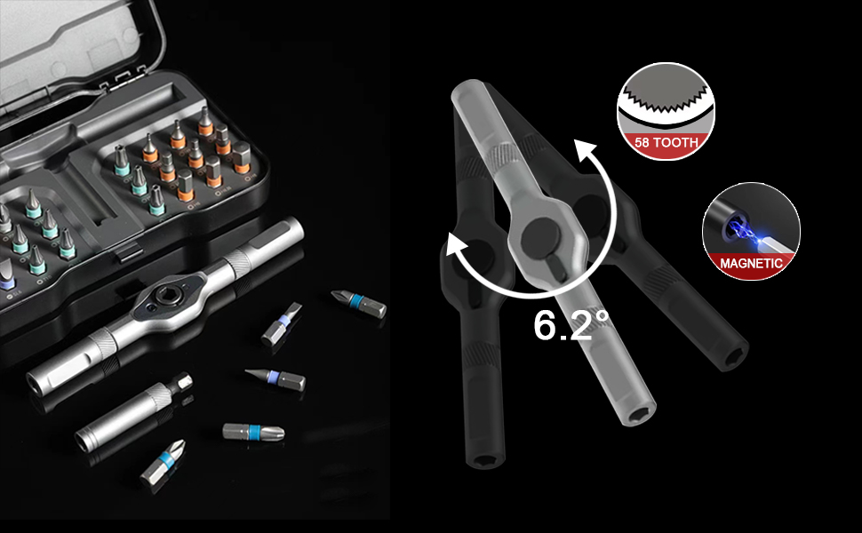 comfortable, hard but not brittle, full of toughness 6.2-degree ratchet effort design No problem in small space, S2 Magnetic Bits positive