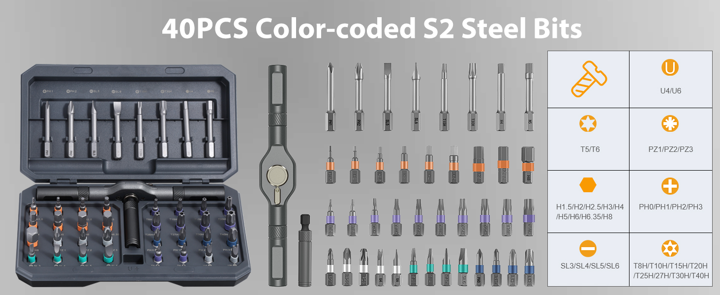magnetic screwdriver set includes 40PCS S2 steel bits, featuring a 6.35mm (1/4") diameter, designed to meet professional needs as well as