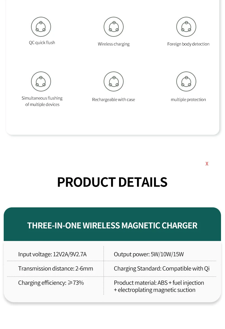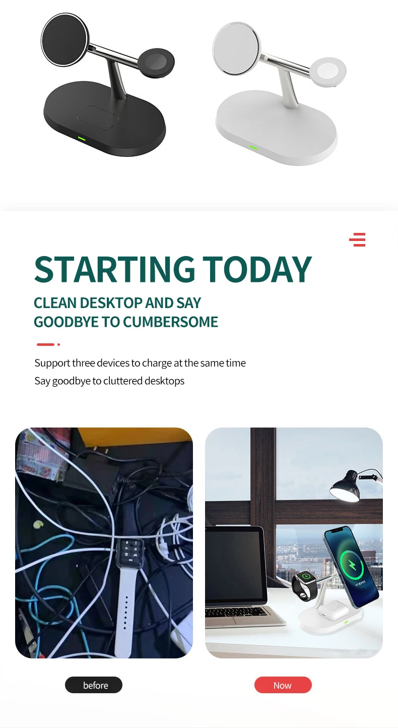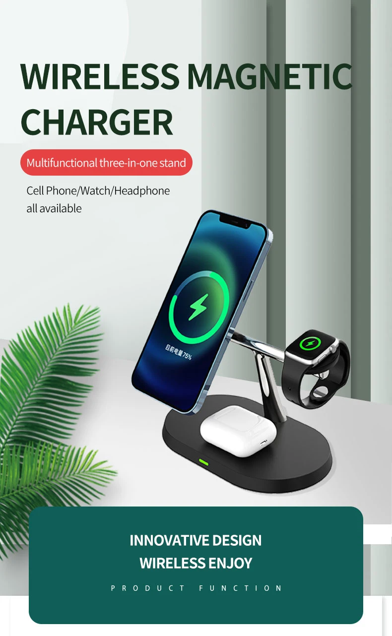 Appearance The 3-in-1 Magnetic Wireless Charger Stand features a sleek and modern design, combining functionality and style. The stand is made of durable materials with a matte finish, ensuring a premium look and feel. Its compact and lightweight design makes it perfect for any space, whether it's your desk, nightstand, or office. The magnetic alignment ensures that your devices stay securely in place while charging.