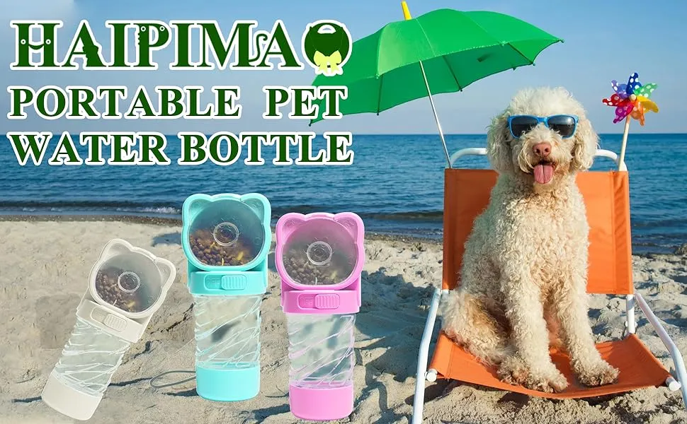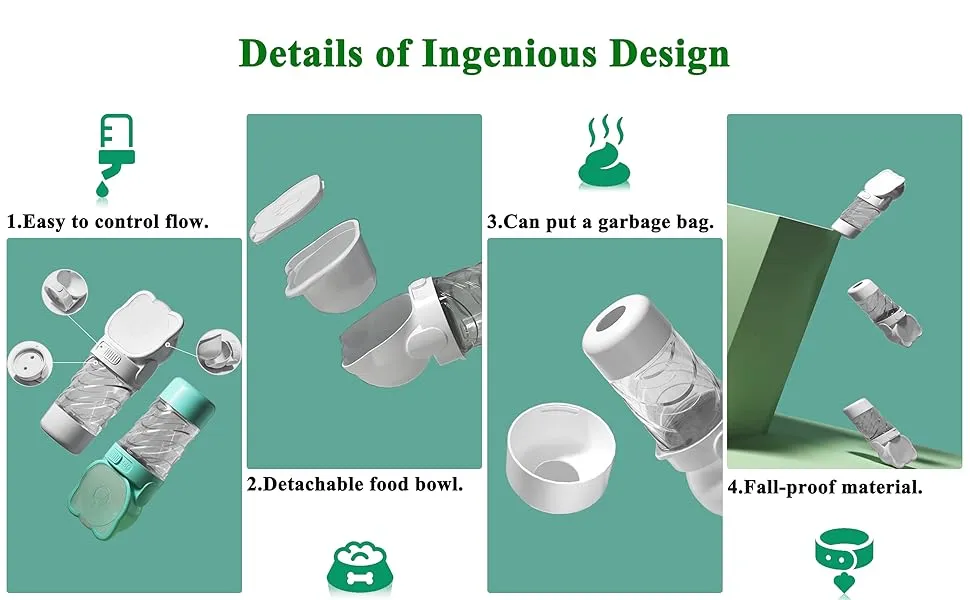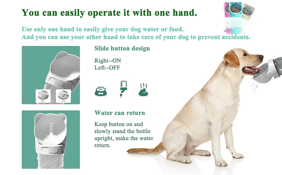 Upgraded Bigger Capacity: This water bottle can hold max 12.3 ounces (350 ml) of water and 200 g food. It not only ensures dog drinking