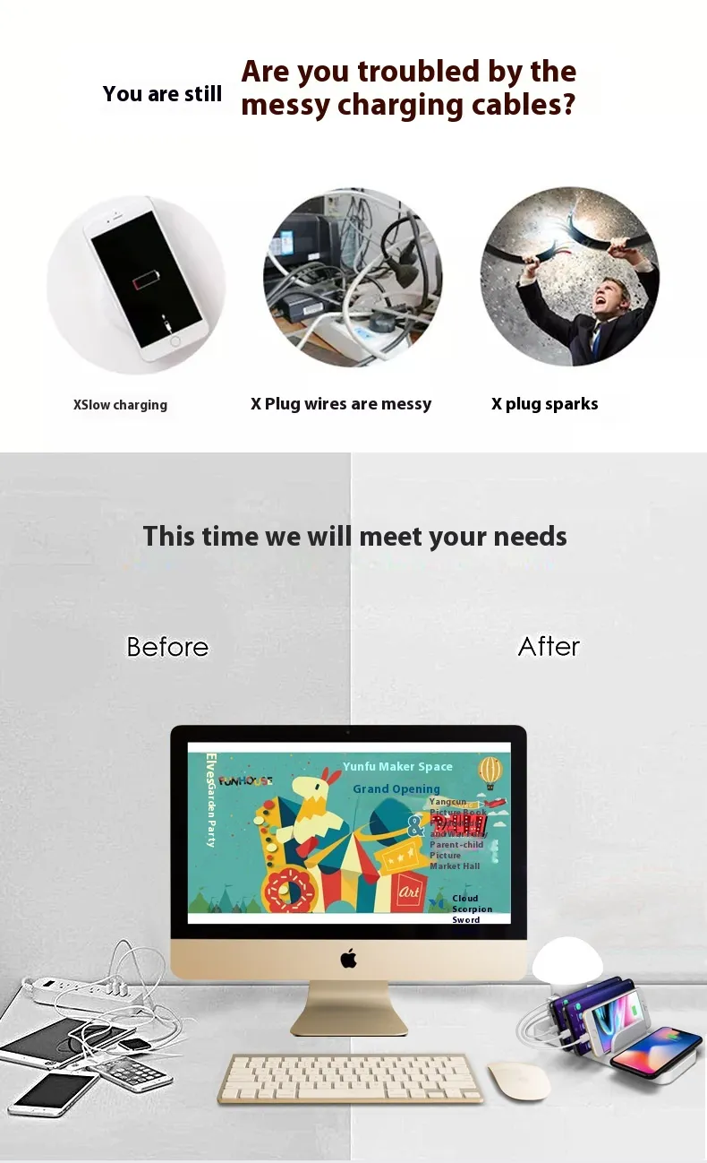 If you’re tired of tangled cables and cluttered spaces, the bracket design elevates your devices, providing a clean and organized charging station. The fast-charging technology ensures that your devices are powered up quickly, and the LED indicators help you keep track of the charging process for each device.