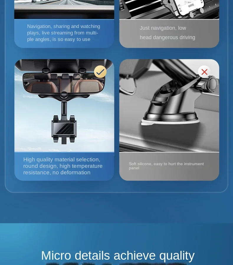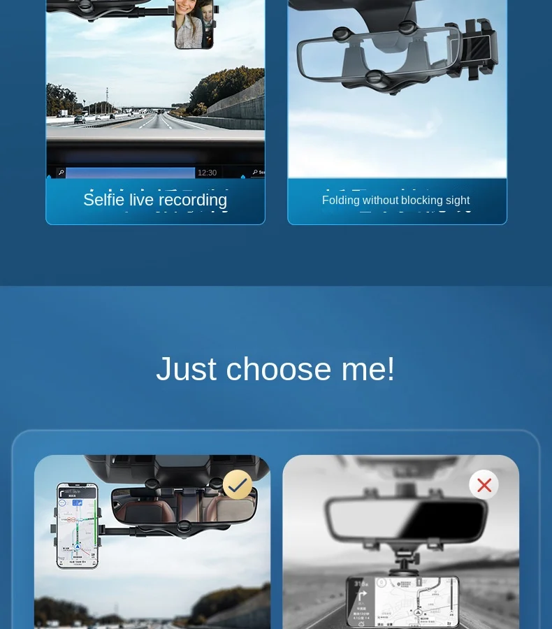 The phone holder is mounted on the car's rearview mirror and levels with it to keep your eyes on the road.No need to look down at navigation, and get a more comfortable and safer user experience.