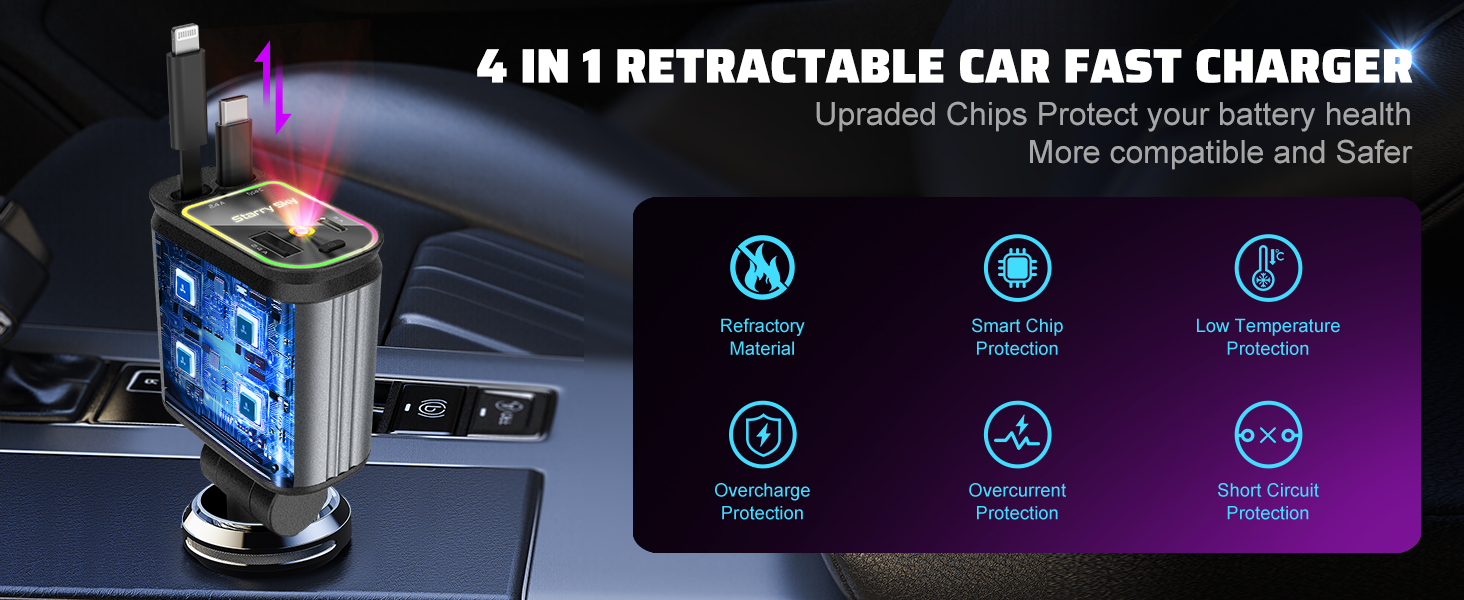 - Retractable Design: With an 80 cm retractable cable range, this charger keeps your car neat and tidy by automatically retracting the cables when not in use.