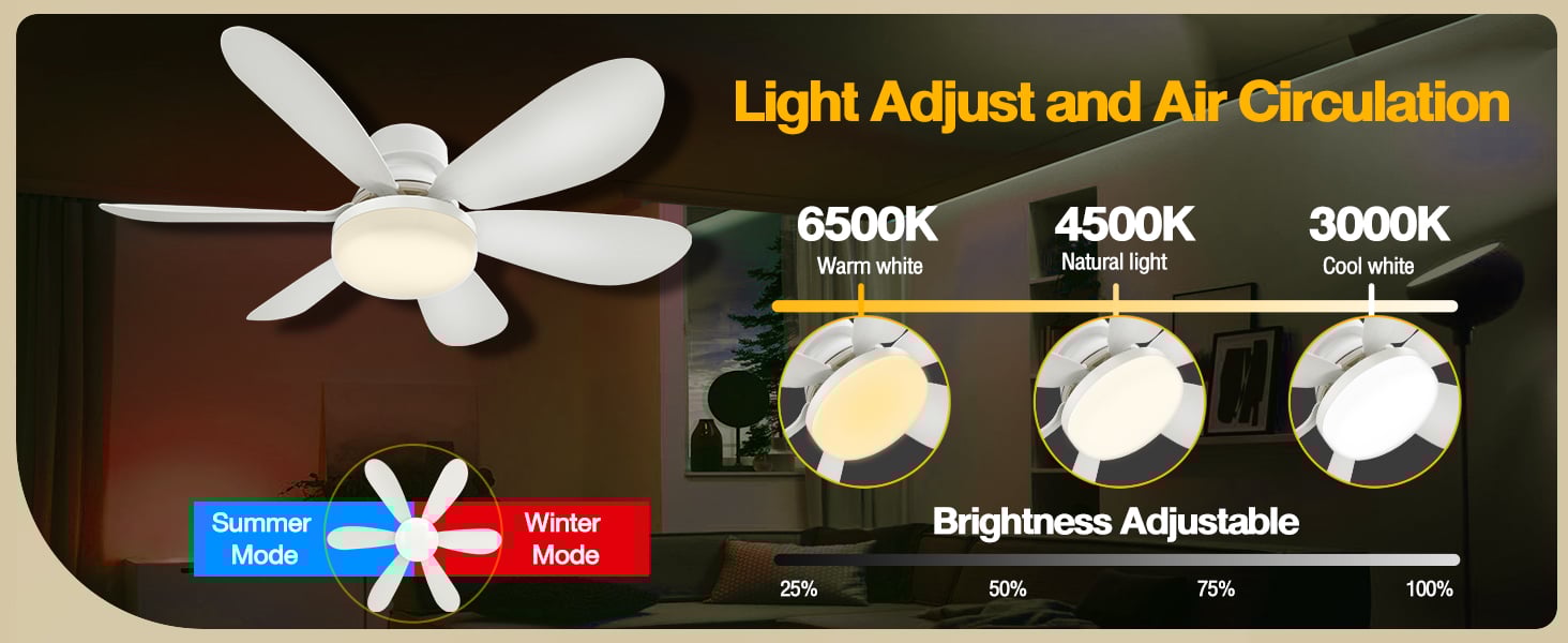 🌞Stepless Color Temperature and Dimming: The ceiling fan with light has Dimmable (0%-100%) and Stepless color temperature from warm white to cool white (3000K-6500K), allowing you to choose different lighting environments. Thanks to its memory feature, when you turn it on again, it remembers the last color setting.