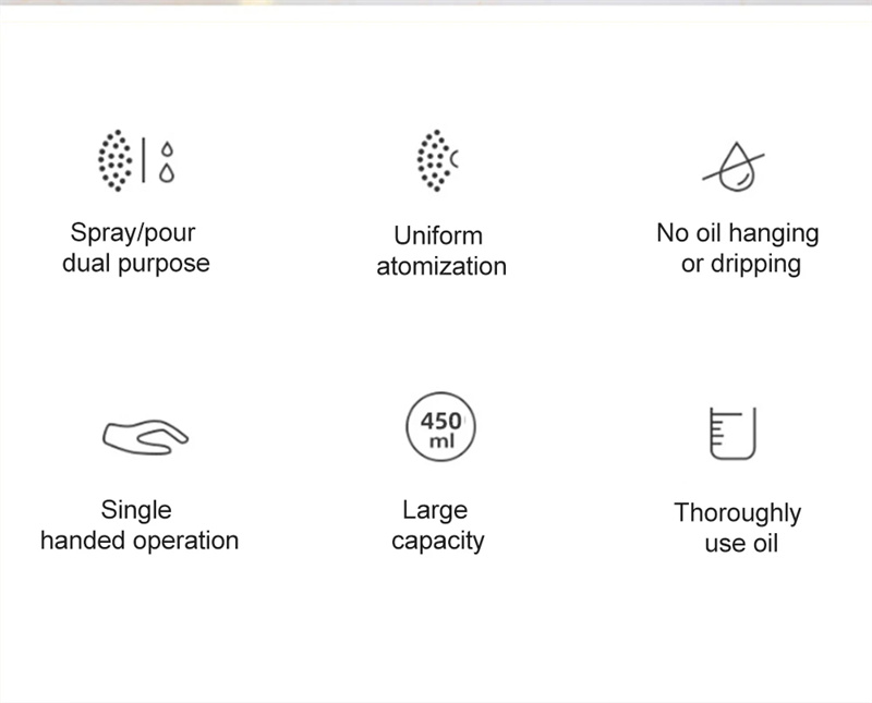 2. Upgrade Nozzle Design: Our oil sprayer for cooking features a cleverly designed nozzle that provides excellent control over the oil distribution. Simply press the spray button for a fine mist or lightly press for a steady stream. Enjoy precise and effortless oil application, ensuring an even coating on your dishes or pans.