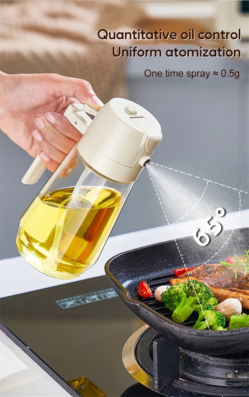 1. Dual Functionality: Our olive oil dispenser doubles as both a spray and a pour bottle, saving valuable kitchen space. Experience the versatility of one product that allows you to switch between spraying a fine mist and pouring a controlled stream of oil, depending on your cooking needs.