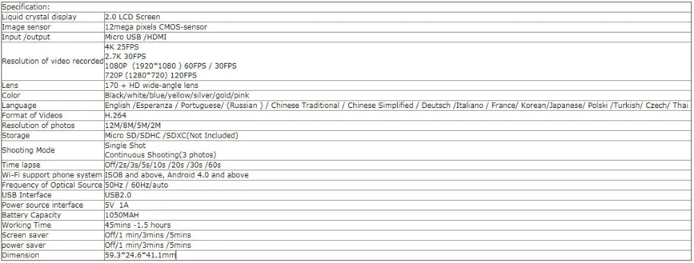 meters under water. * 12-megapixel HD 170 wide-angle lens. * Wi-Fi control range is 3m.Supported, Android /ISO APP *