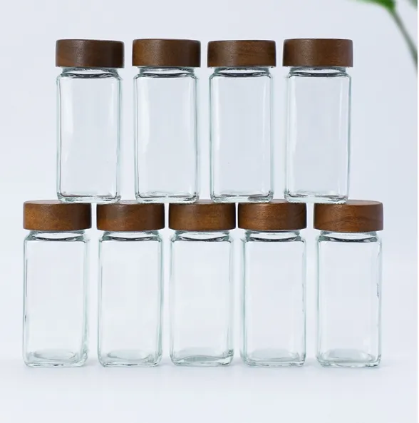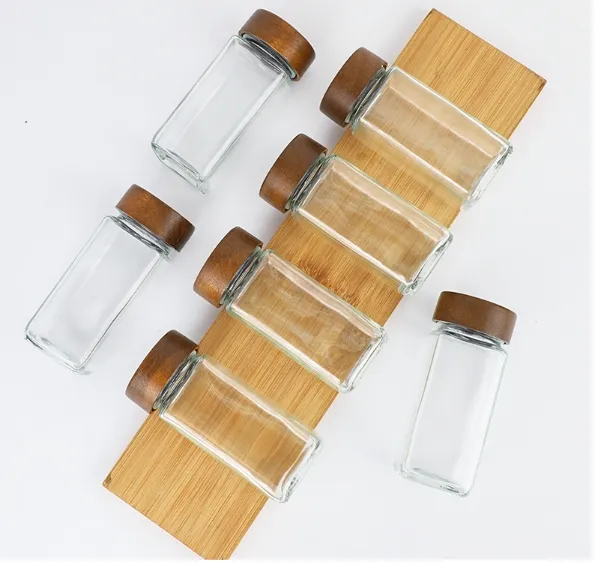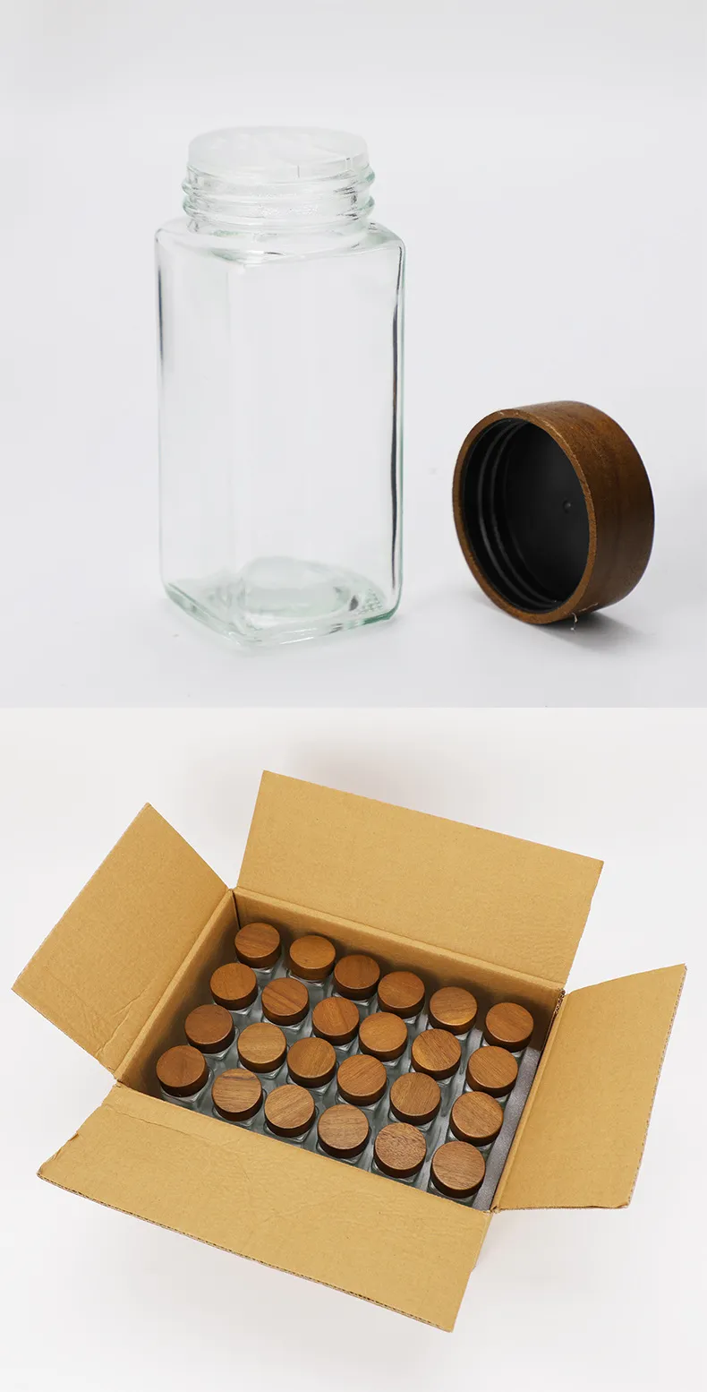 4oz Acacia Wooden Lid Square 120ml Barbecue Cumin Pepper Scattering Granules Seasoning Glass Spice Bottle Suit