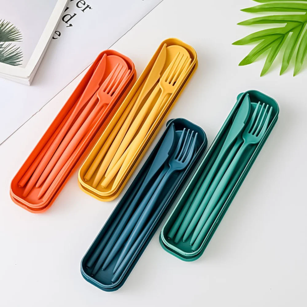 1. Reusable Cutlery Set with Box:The reusable cutlery set contains four color cutlery sets: yellow, orange, green, blue. The portable