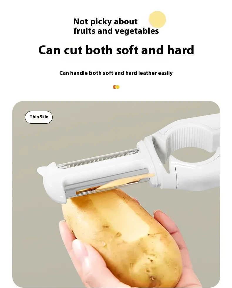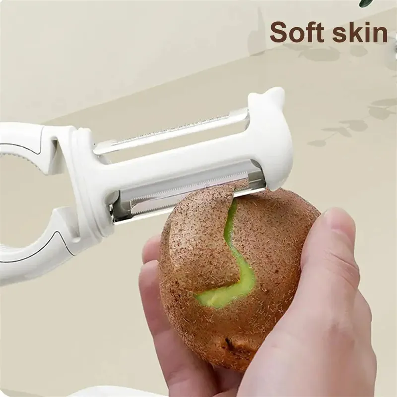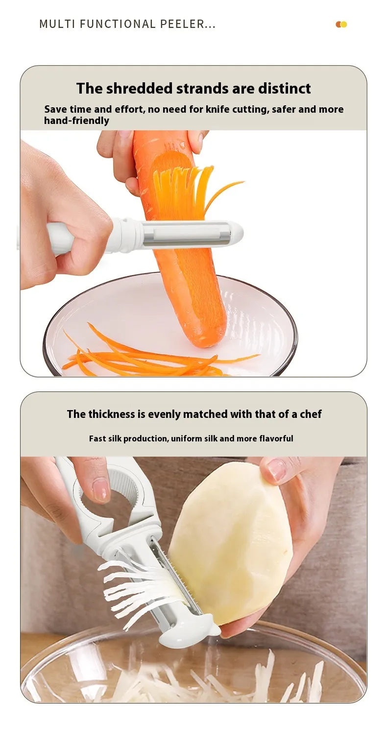 - Multi functional vegetable and fruit peeler: a five in one product that combines peeling, shredding, drilling, bottle opening, and can lifting. It is most suitable for potatoes, vegetables, apples, vegetables, carrots, mangoes, cucumbers, tomatoes, onions, pears, and more. Built in potato eye remover, high-quality kitchen appliance peeler.