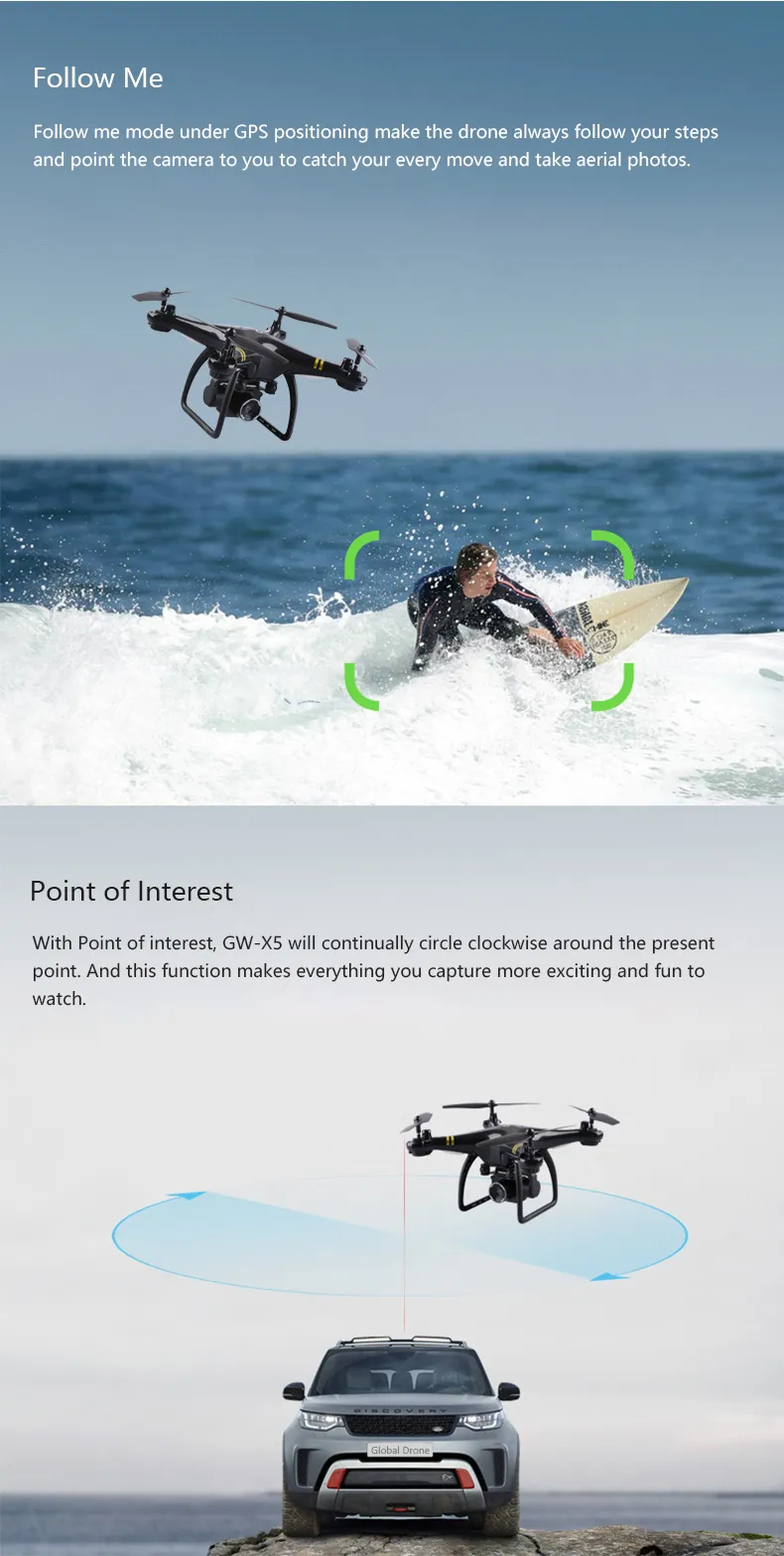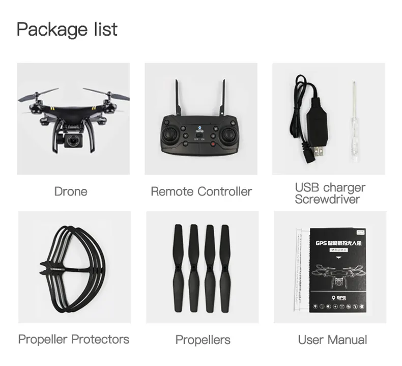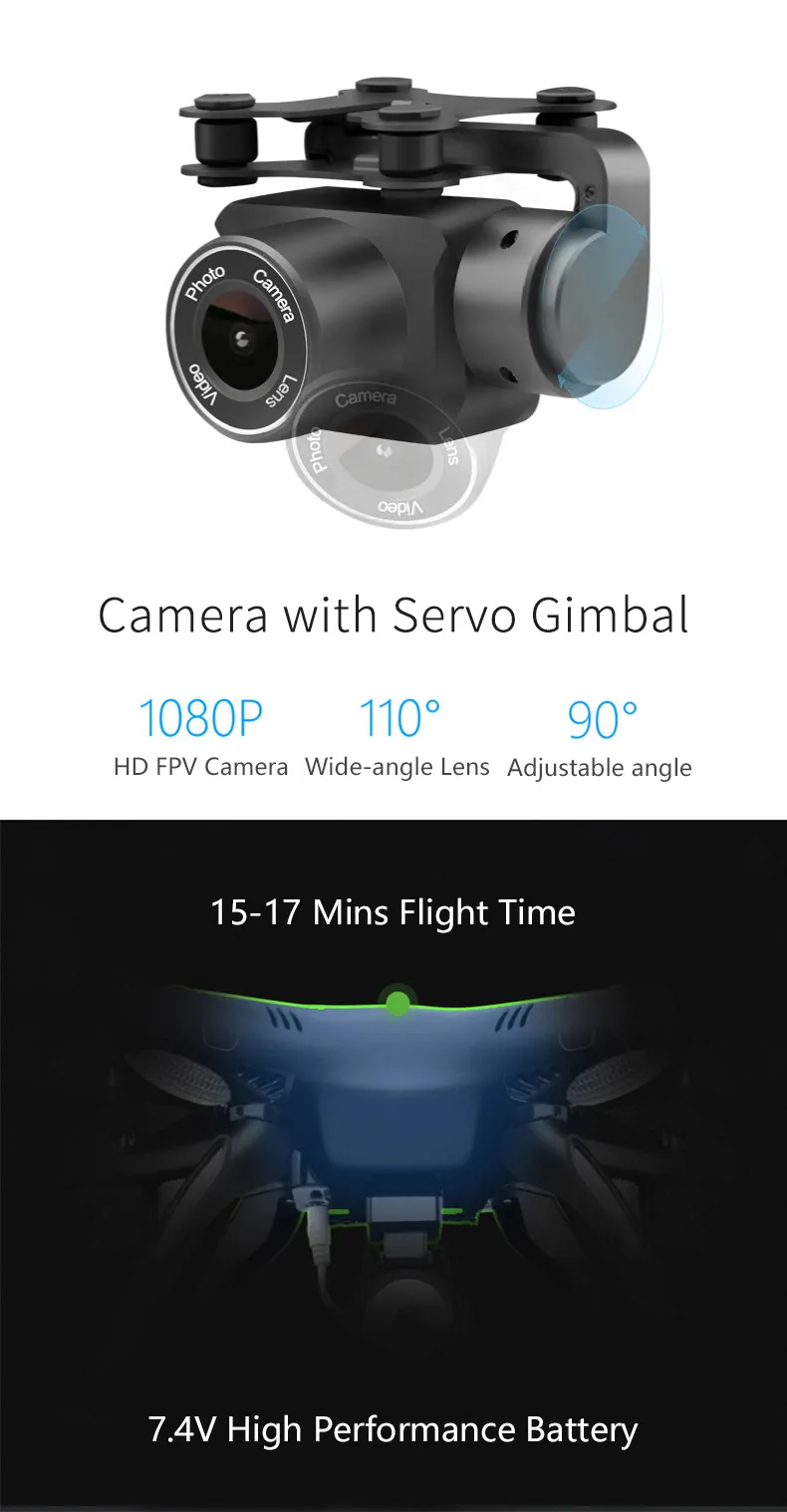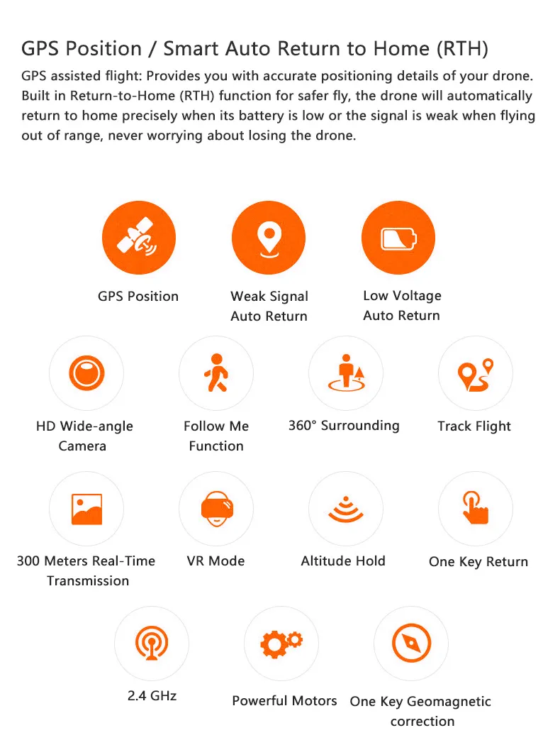 Function: up and down, left turn right turn, forward and backward, left and right side fly, follow mode, LED light, 3D roll, headless mode, fixed height mode, surround mode, trajectory flight, electric steering gear, photo recording, APP gravity , WIFI map transmission, induction operation, one-button take-off / landing;