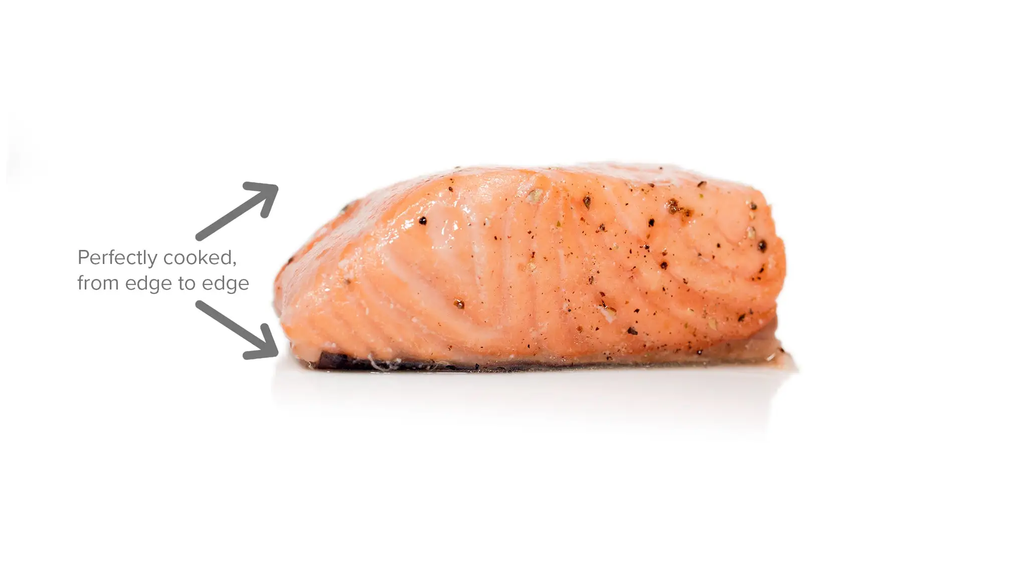 The salmon cooked sous vide (left) remains a translucent pink, with a delicate, flaky texture. The pan-cooked salmon (right) has overcooked edges because the surface temperature of the pan is higher than the target cooking temperature. As it dries out, it begins to expel the white albumin.