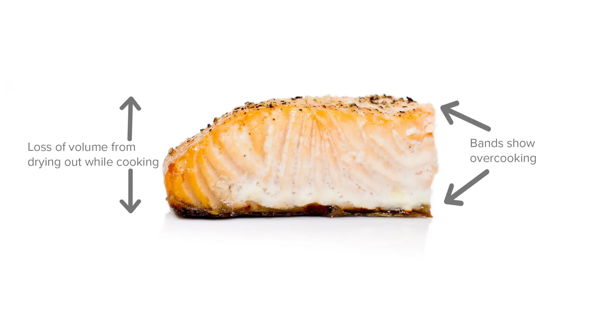 The salmon cooked sous vide (left) remains a translucent pink, with a delicate, flaky texture. The pan-cooked salmon (right) has overcooked edges because the surface temperature of the pan is higher than the target cooking temperature. As it dries out, it begins to expel the white albumin.