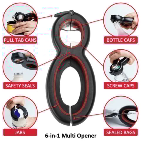 - All in one - save space! no need to bring 6 different tools with 6 different functions! this opener does it all!