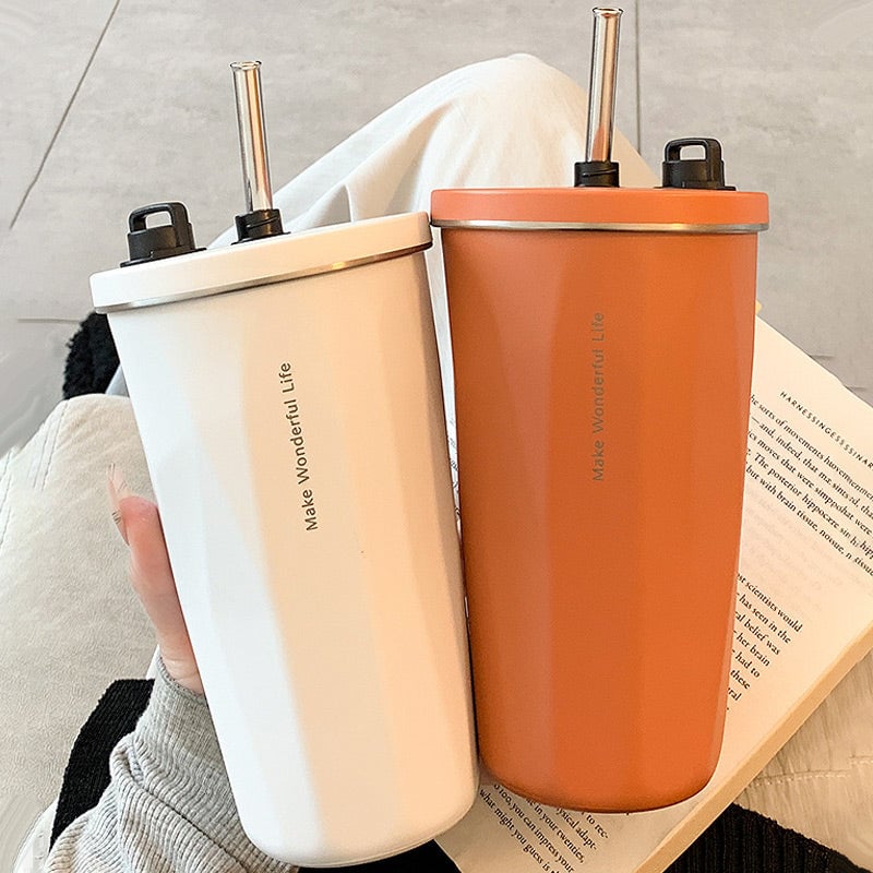 Coffee Cup with Straw and Lid - A retractable straw, with silicone part at the bottom. This allows the straw to retract back into the mug when not in use or bounce out of straw hole when in use. The lid of the cup is designed to a spiral buckle, and has a straw hole with a lid. The straw lid is designed to fit onto a specially equipped lid buckle when straw is in use, and screwed onto the straw hole when straw is not in use.