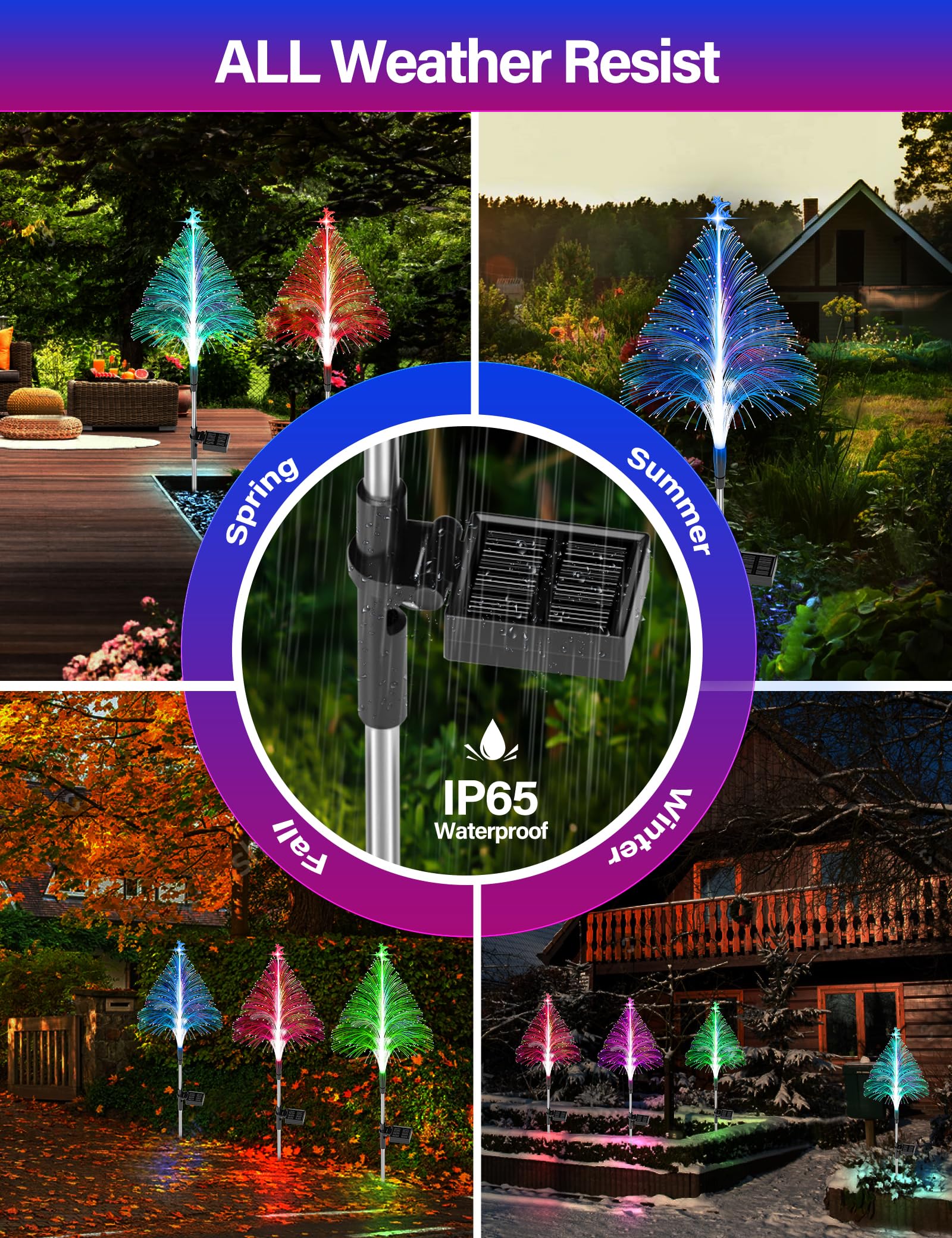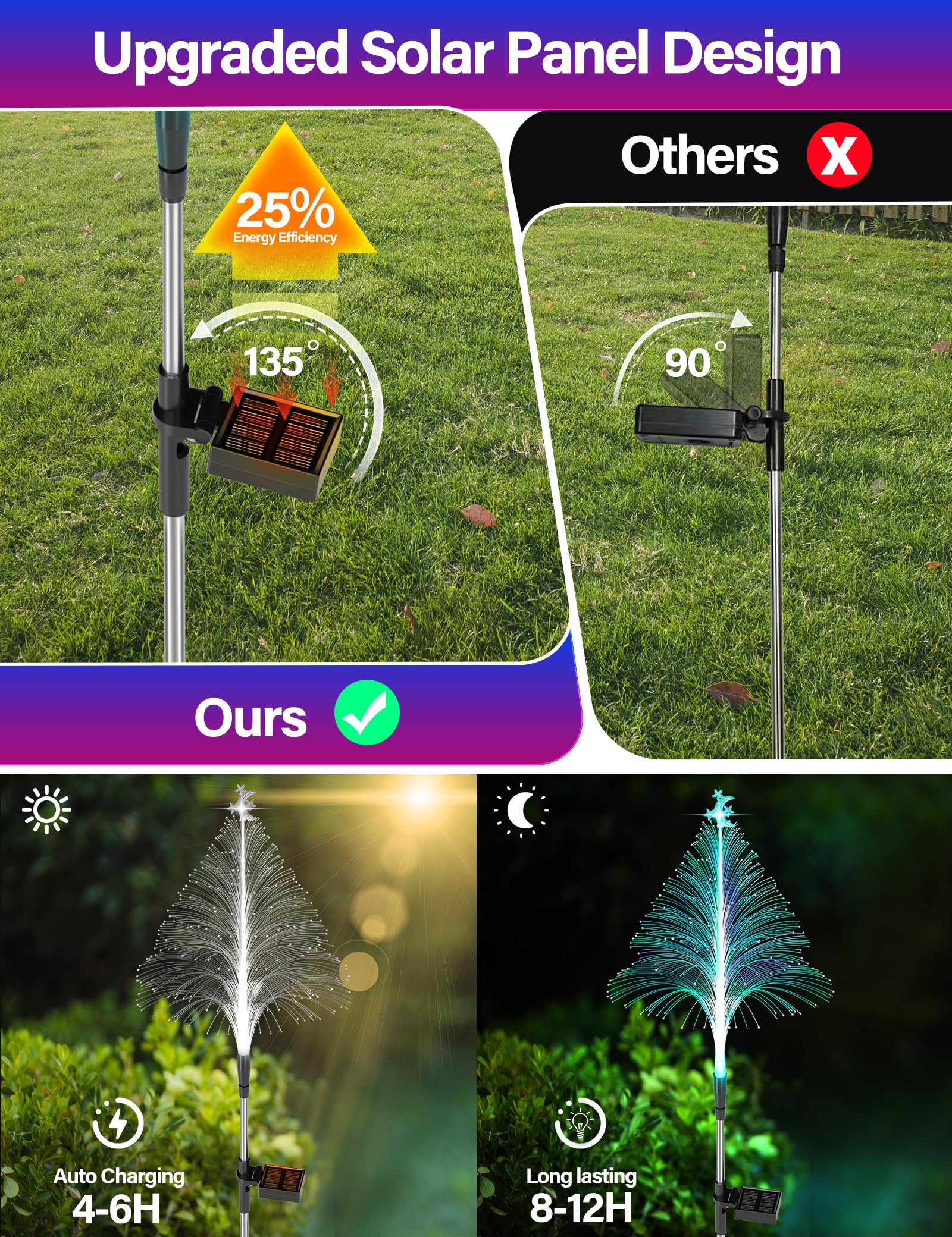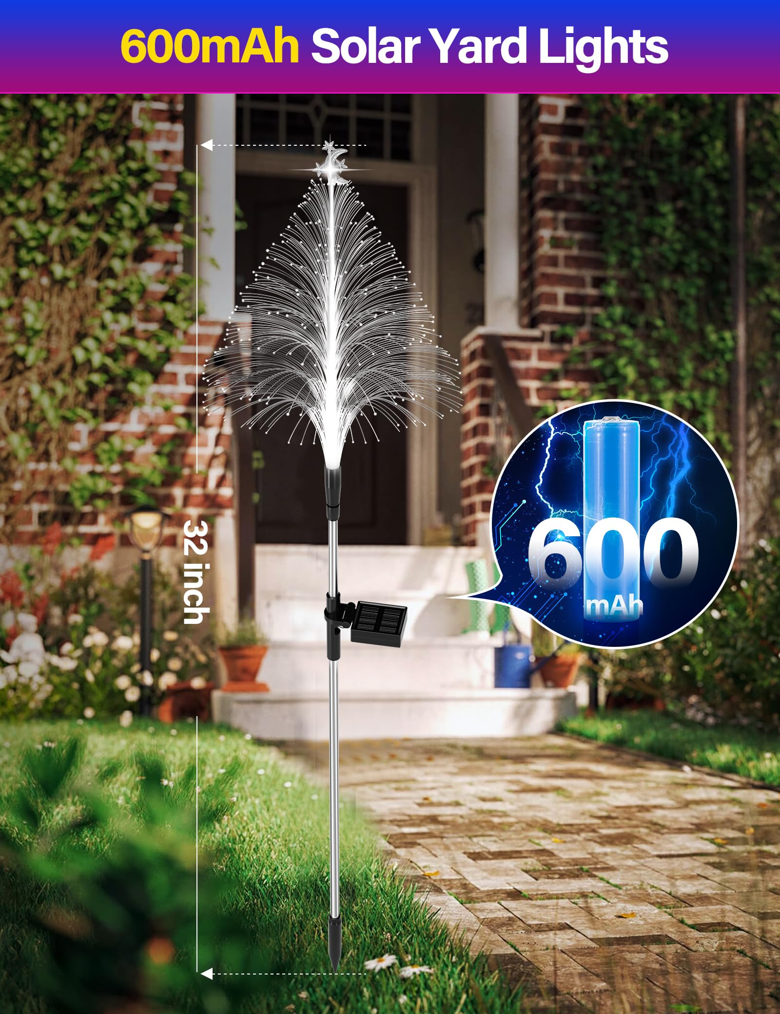 【12H Long Lasting Solar Tree】: The Christmas decorations outdoor solar lights with 600mAh powerful batteries. Auto charging for 4-6 hours during the day, and last for 8-12 hours at night. The solar outdoor decorative light features fast charging and long battery life. Keep your garden immersed in a colorful atmosphere all night.