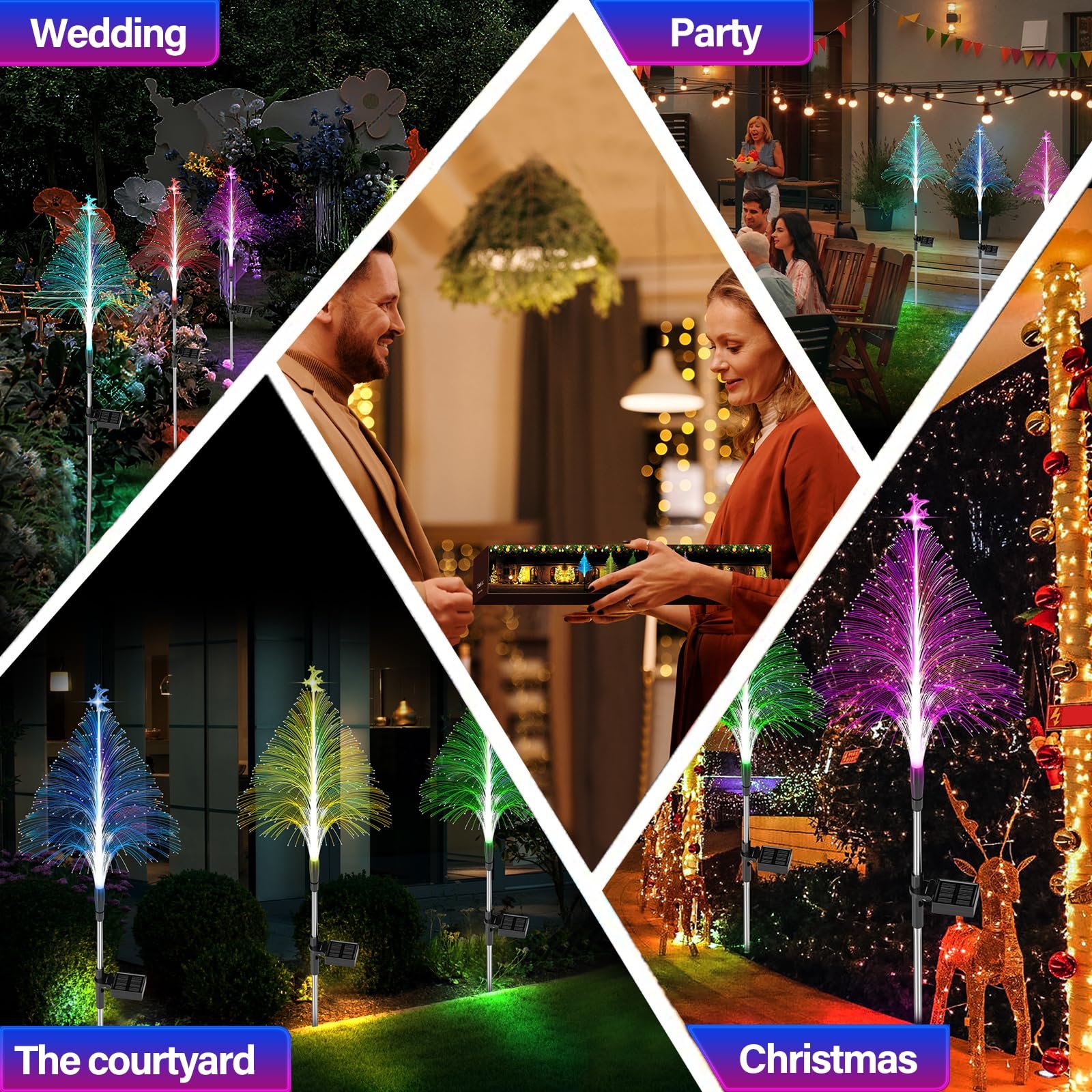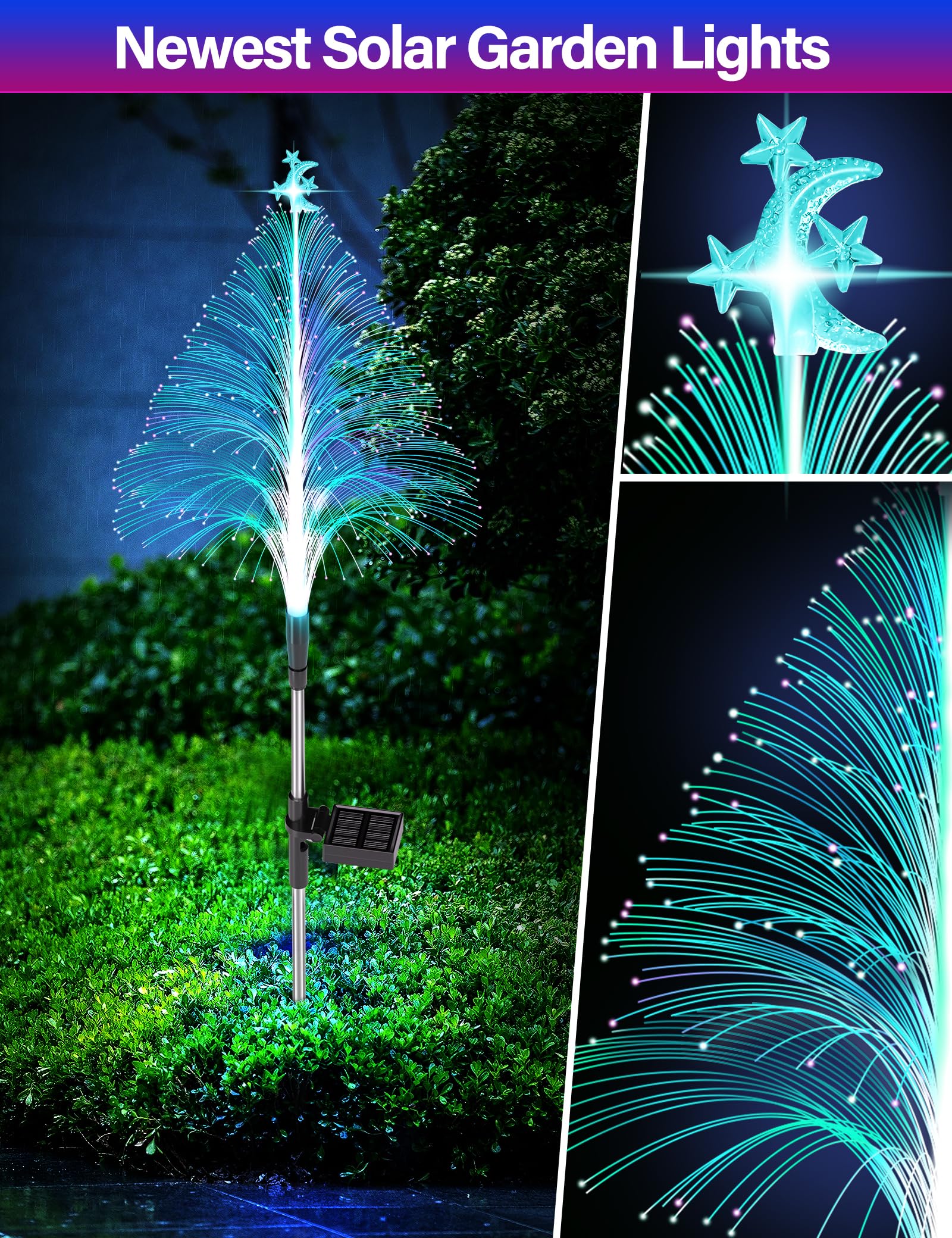 【Unique Solar Christmas Trees】:Solar garden lights simulate the real xmas trees shape, unlike ordinary pine tree, solar garden lights are made of high quality fiber optic and ABS material, decorated with fun moon and star accessories on the top. Features strong light transmission, brighter lights and RGB colorful lighting change. Perfect for garden, yard, patio, flowerbed, fence, lawn, pathway, walkway, backyard, courtyard, front yard, campsite, grave, cemetery, landscape lamp, xmas decorations!