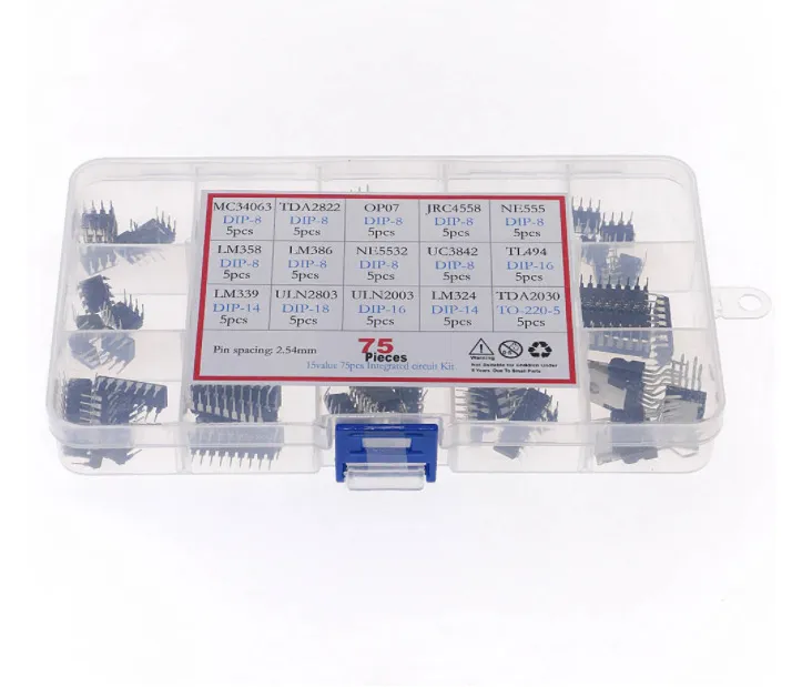 The 75pcs Universal DIP IC Kit is the ultimate collection for anyone working with electronics, circuit design, or DIY projects. This comprehensive kit contains 75 essential Dual Inline Package (DIP) ICs, designed to provide everything you need for your electrical engineering, prototyping, and soldering needs. Whether you're a beginner, hobbyist, or experienced technician, this kit offers a convenient, organized solution for your IC component needs.