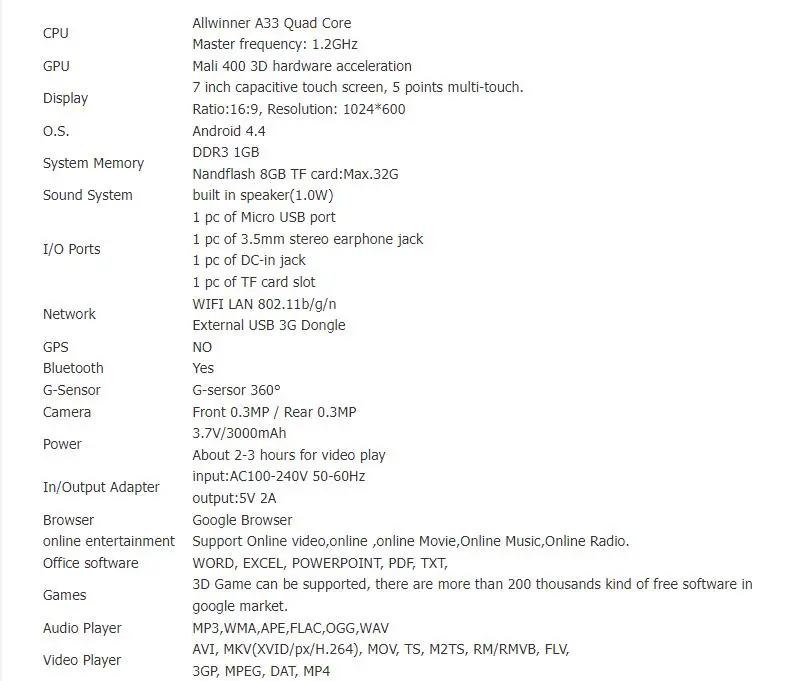 1 pc of tablet pc 1 pc of USB cable 1 pc of OTG cable 1 pc of manual(English) 1 pc of charger: AC adapter AC100-240V 50-60Hz 5V 2A 1 pc of case