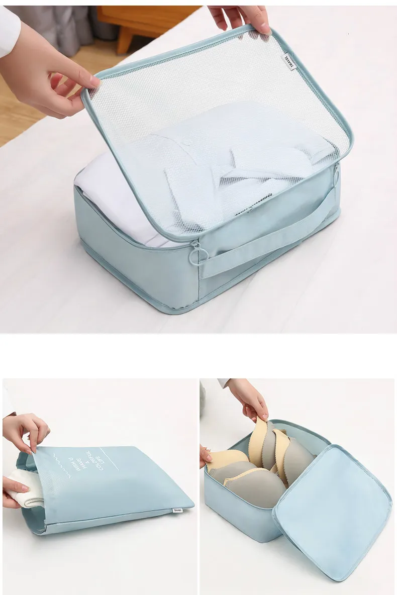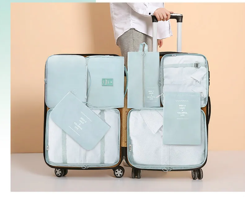 Shop the 8-piece Set Luggage Divider Bag for efficient travel storage. Organize clothes, shoes, underwear, and accessories with these packing cubes. Perfect for business trips, family vacations, and more!