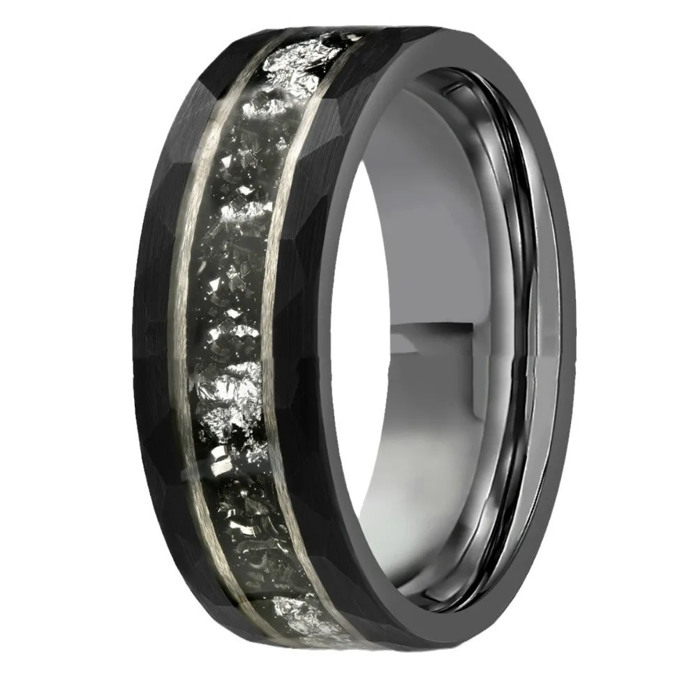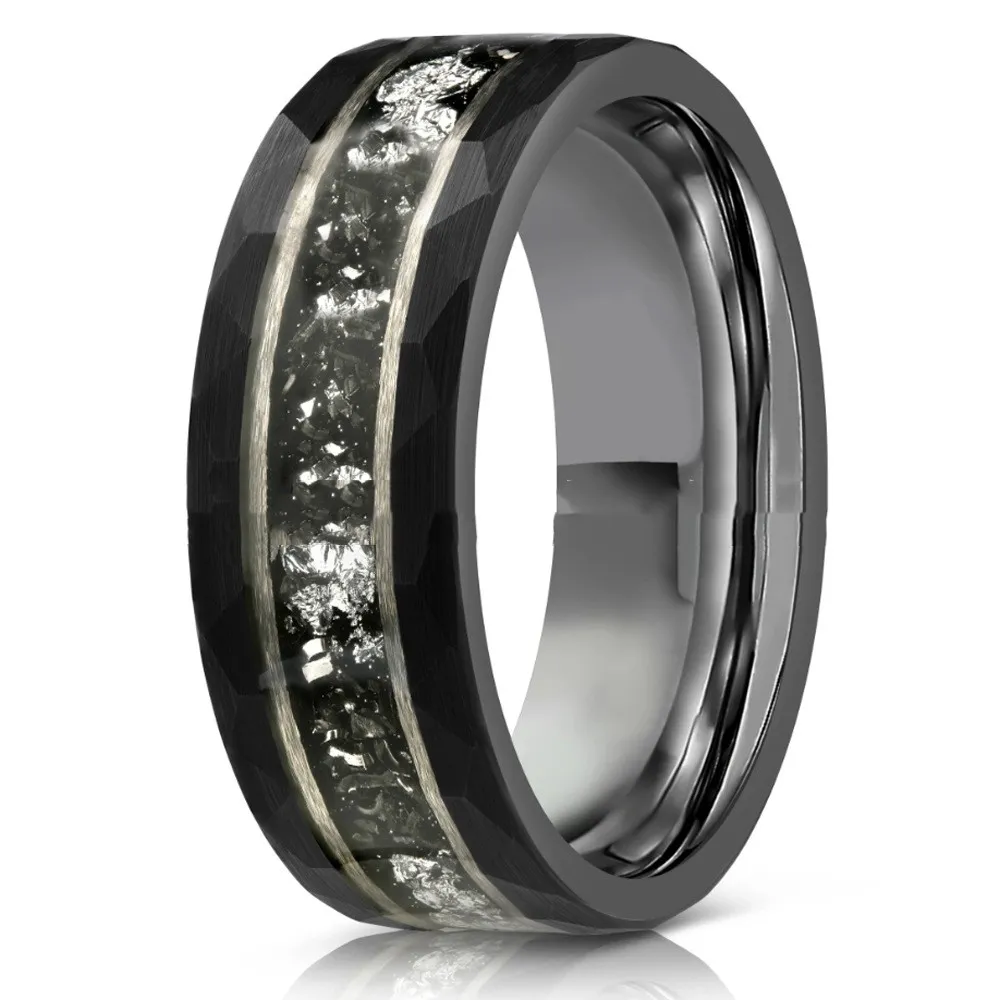 8mm Electric Black Hammer Pattern Tungsten Ring Steel Color Inner Step Inlaid Iron Chips Silver Foil