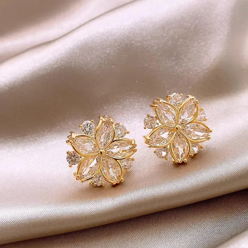 925 Sterling Silver Needle Exquisite Five Petal Flower Crystal Stud Earrings