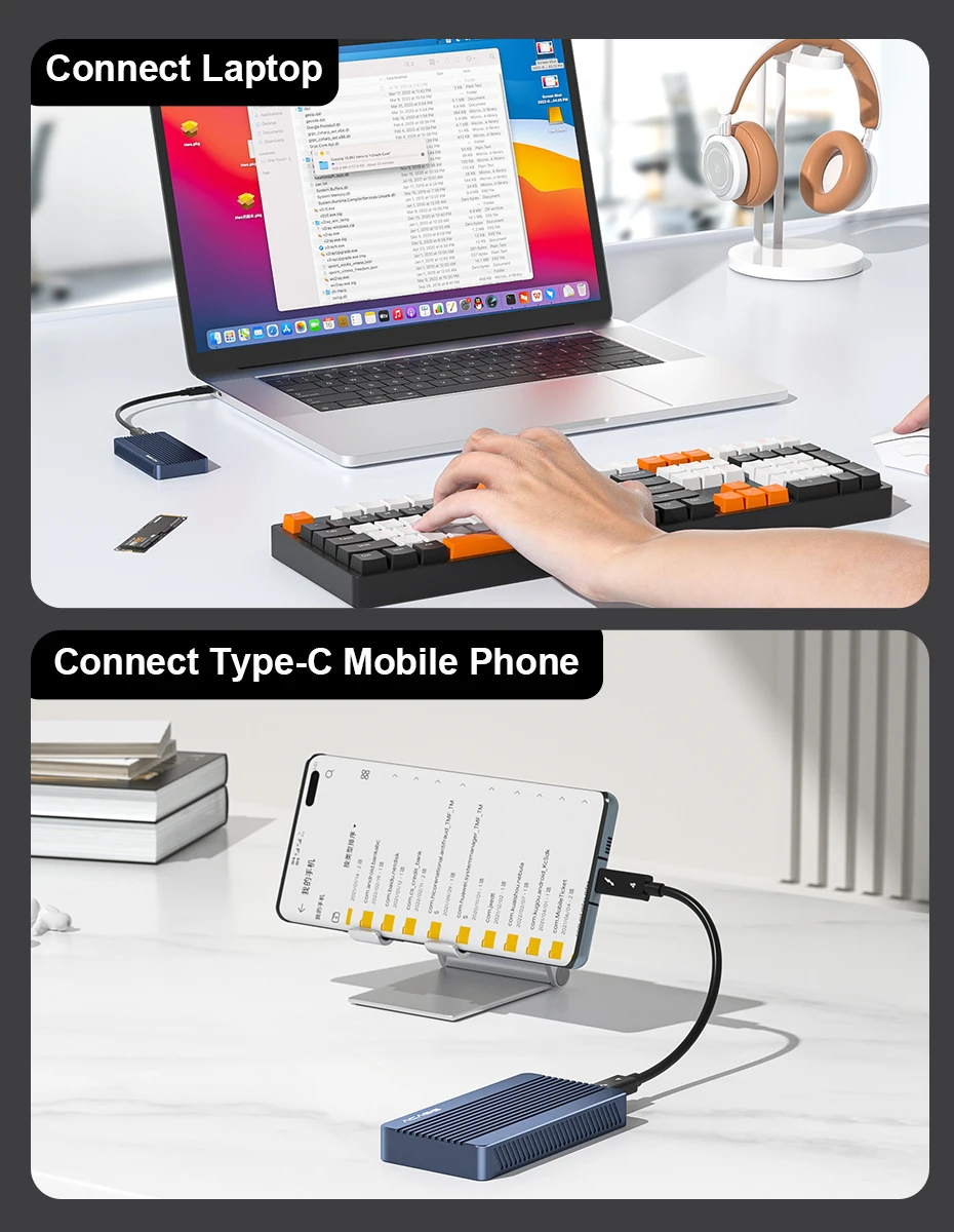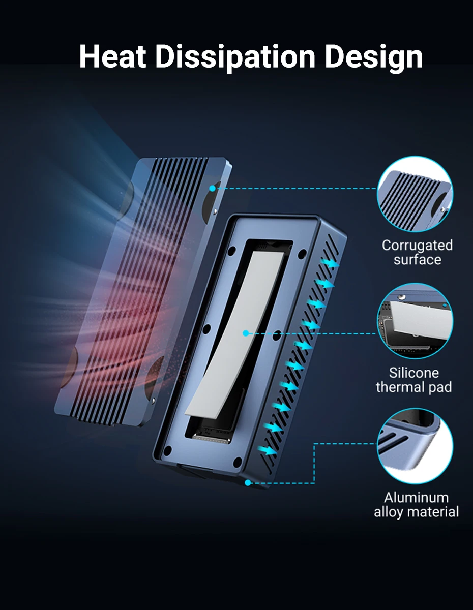 The case features a tool-free design, allowing you to easily install or replace the SSD without additional tools.