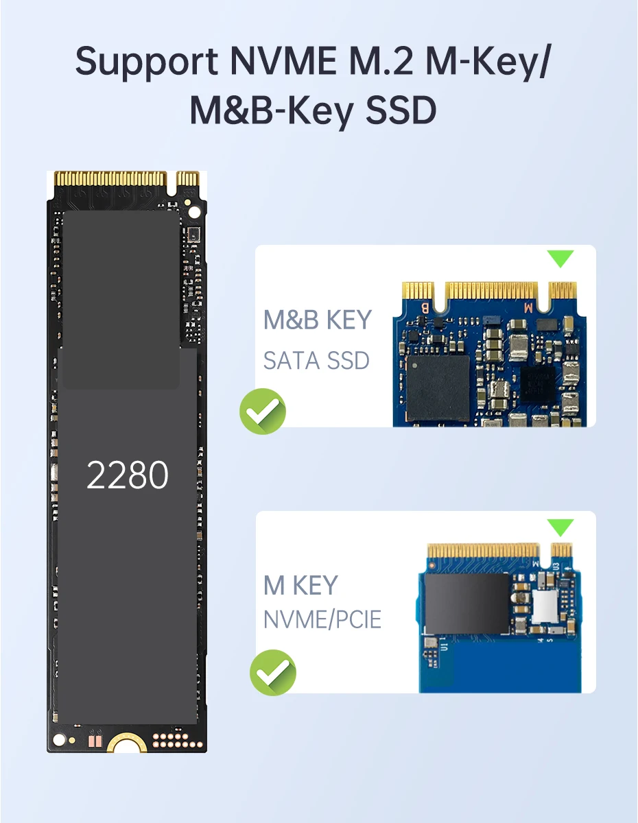 Compatible with NVMe M.2 SSDs up to 8TB, providing ample space for high-volume data storage and backup needs.