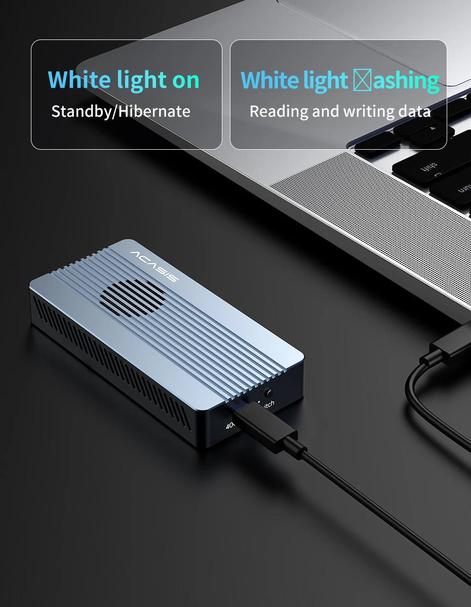 2. Built in silent fan: Acasis 40Gbps USB 4.0 SSD Case is built in silent fan, helping dissipating the heat better, and there is a switch for you to control the fan. While using, the fan is silent,