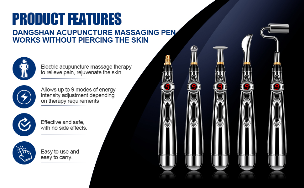 - Low Voltage Massage Therapy: Electric Meridians Acupuncture pen, no pain, no needles easily focus on pain areas, stress relief, relaxation and adjustable intensity controls.