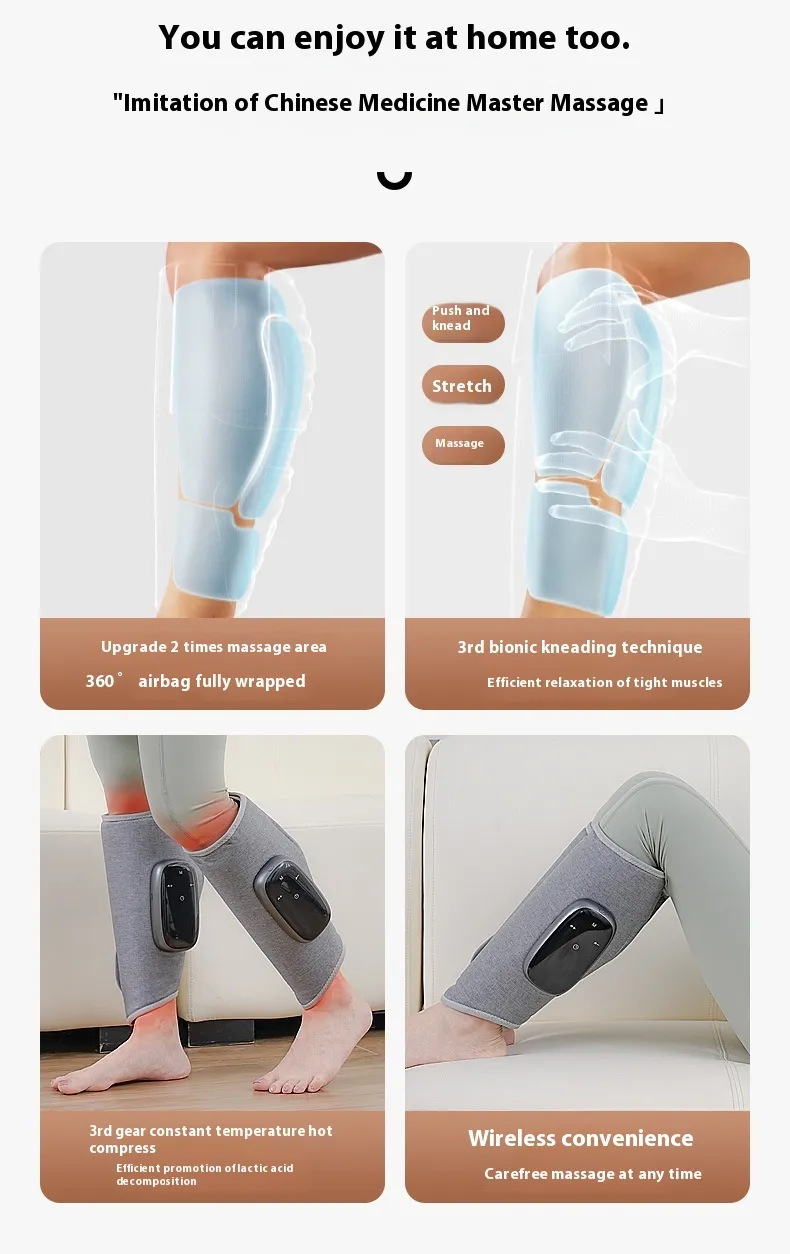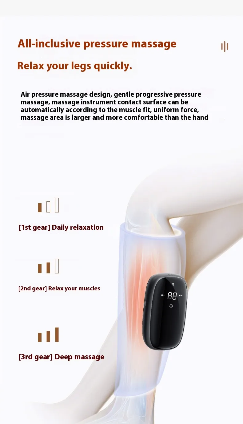 The air wave technology gently applies pressure to your calves, simulating the feeling of a professional massage by promoting better circulation and reducing muscle tension. The integrated graphene heating function enhances the experience by providing gentle warmth that penetrates deep into your muscles, helping to alleviate soreness and stiffness. This massager is perfect for athletes, people with physically demanding jobs, or anyone who suffers from fatigue, swelling, or general leg discomfort.
